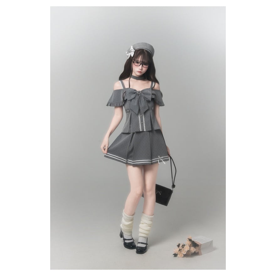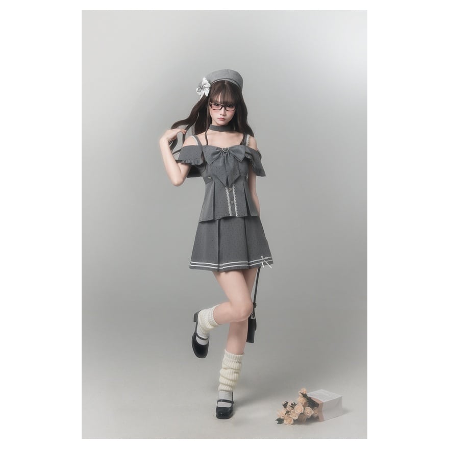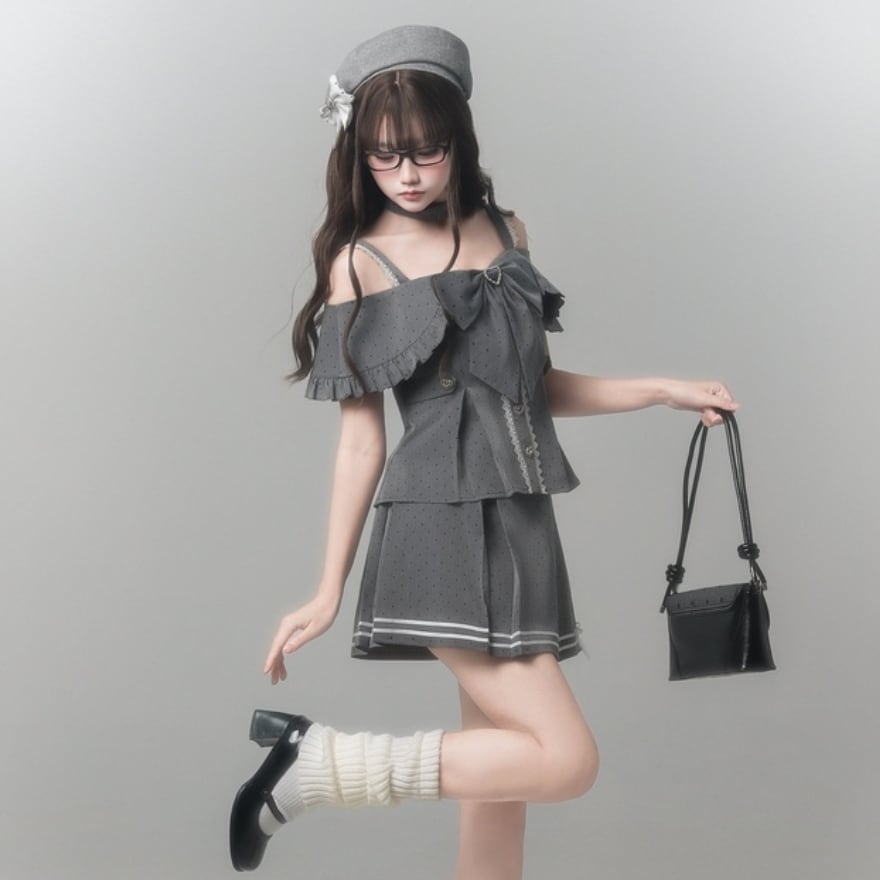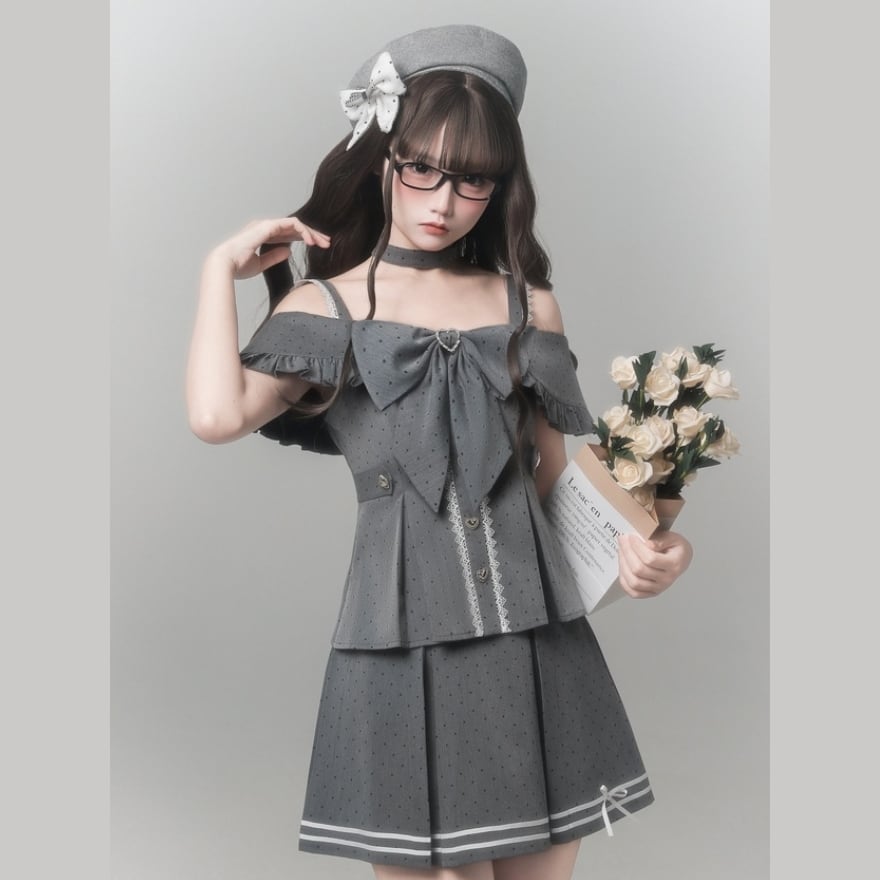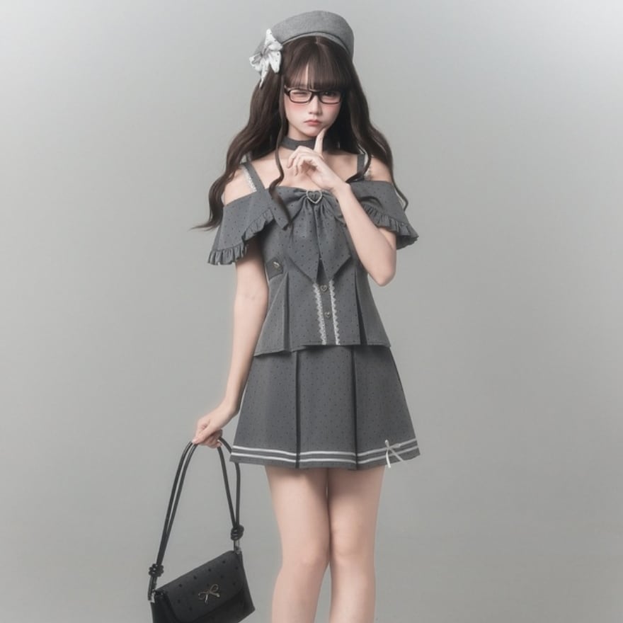 オフショルダーの抜け感に、大きなリボンとハートディテールを重ねることで、可憐さの中へ視線を奪う印象を添えています。グレーの落ち着きがあるので、甘くなりすぎず取り入れやすい一着です。