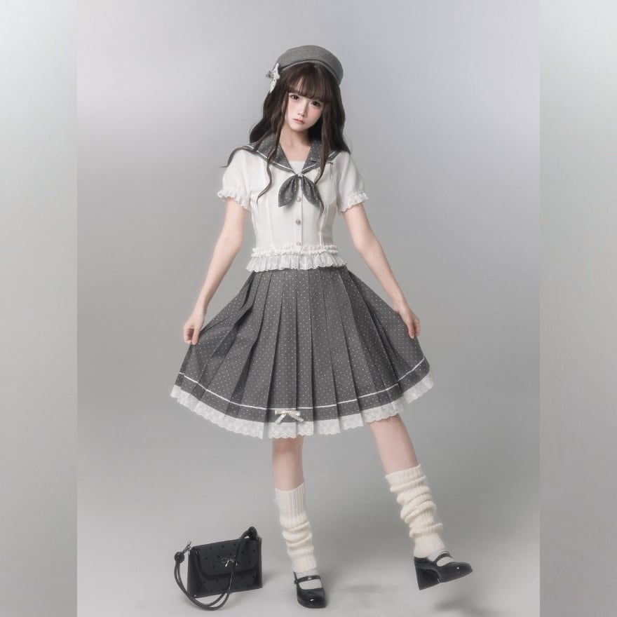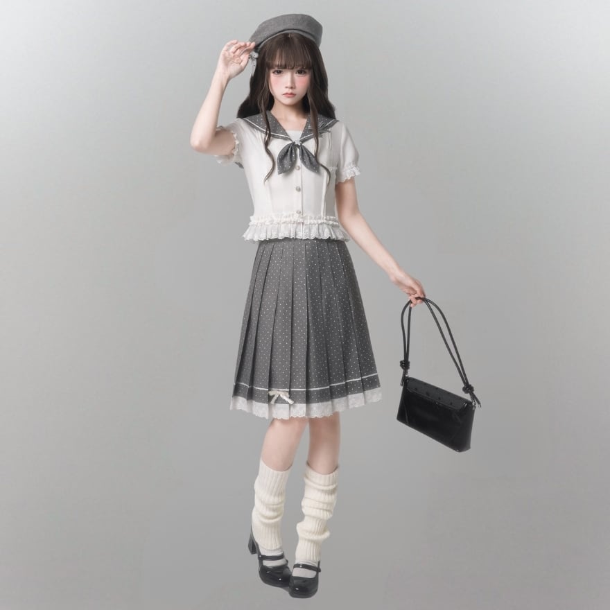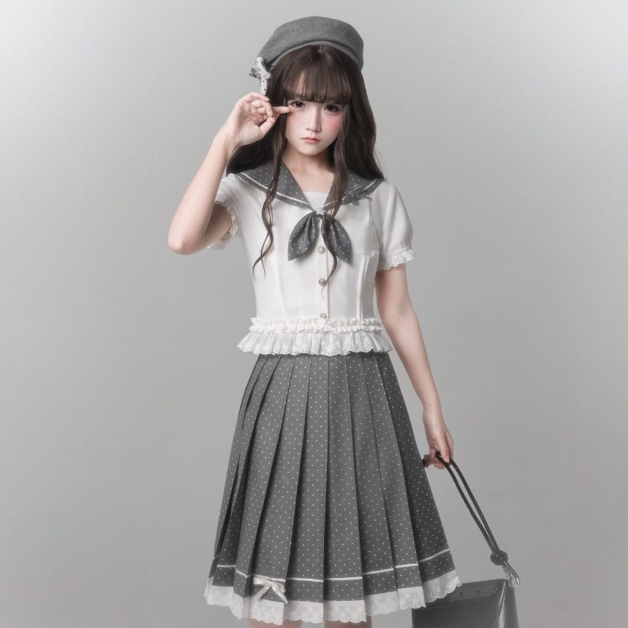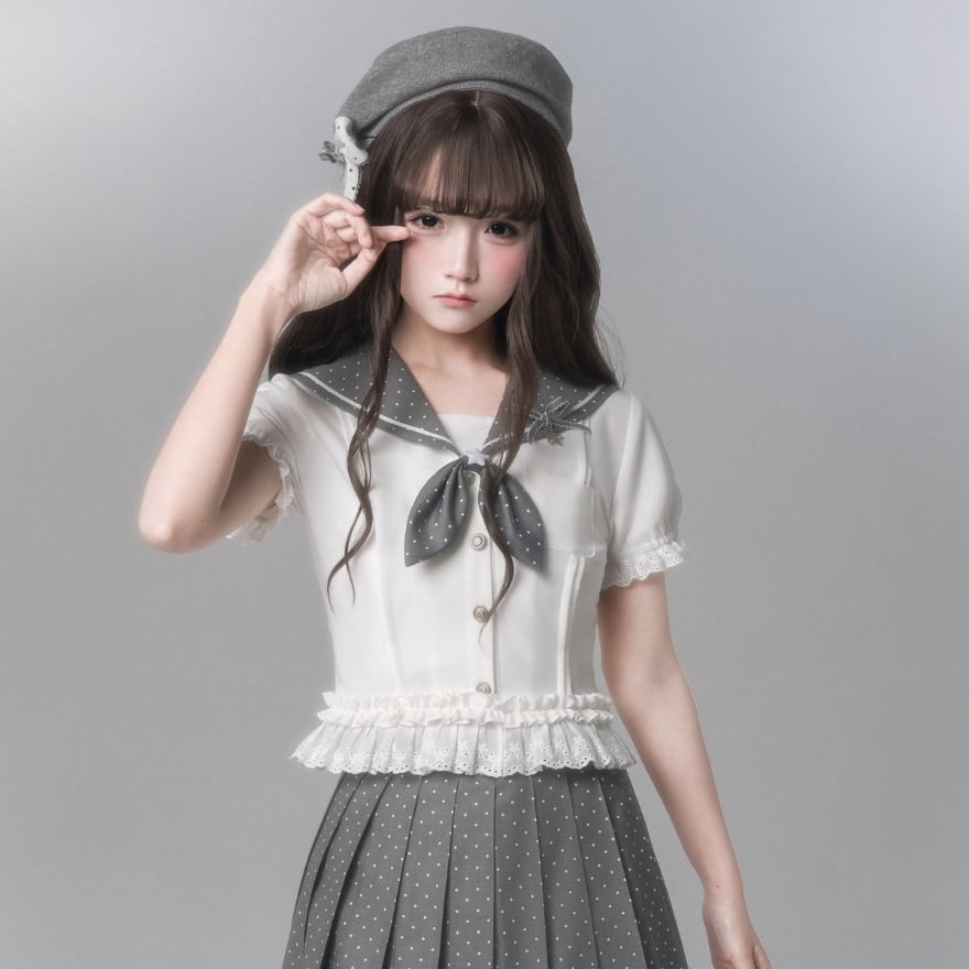 やわらかな少女感の中に、整えられた静けさがあるトップスです。セーラーカラーのきちんとした印象と、袖口や裾に重なるフリルの甘さが重なることで、制服風の可憐さをやさしく引き立ててくれます。グレーのリボンが加わることで、ただ甘いだけでは終わらない、少し知的な佇まいにまとまります。