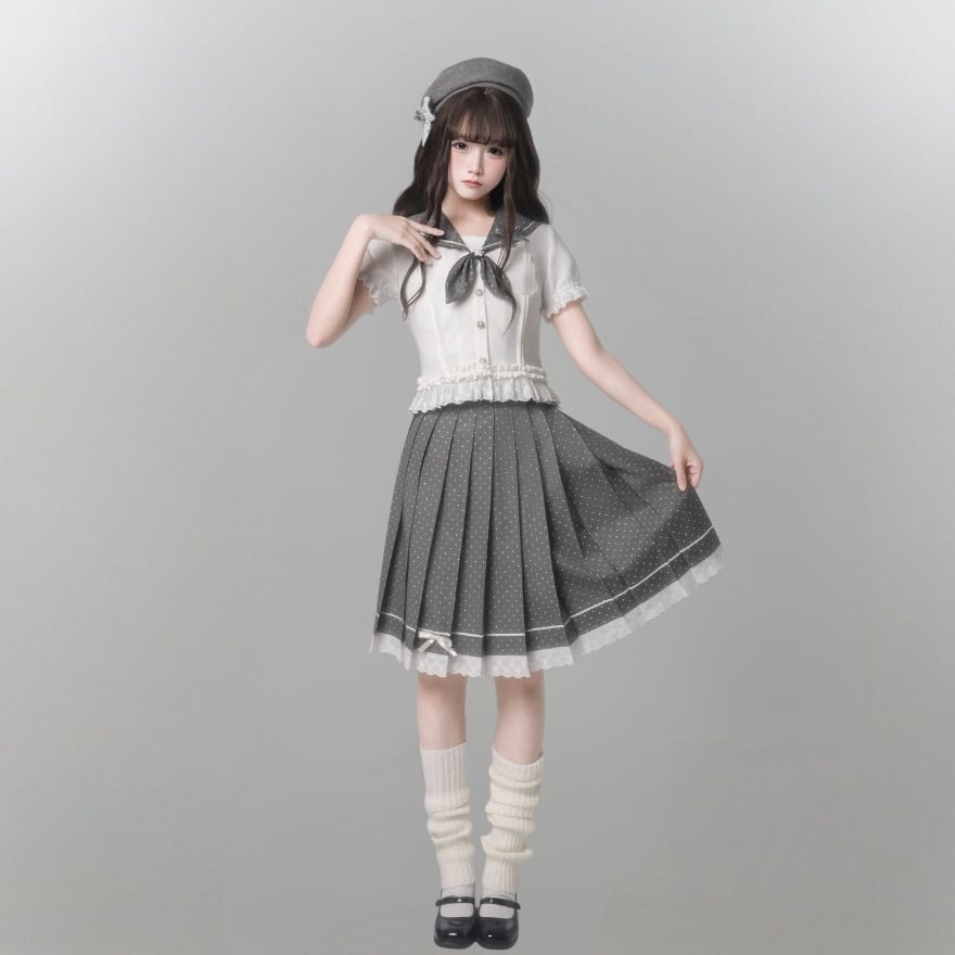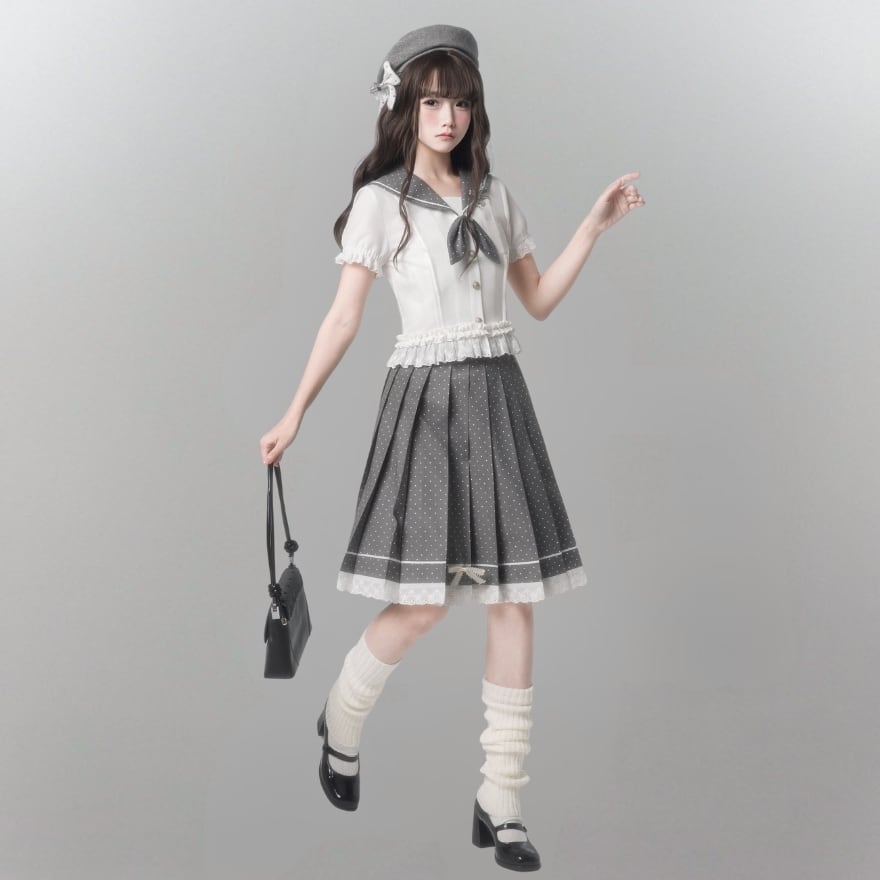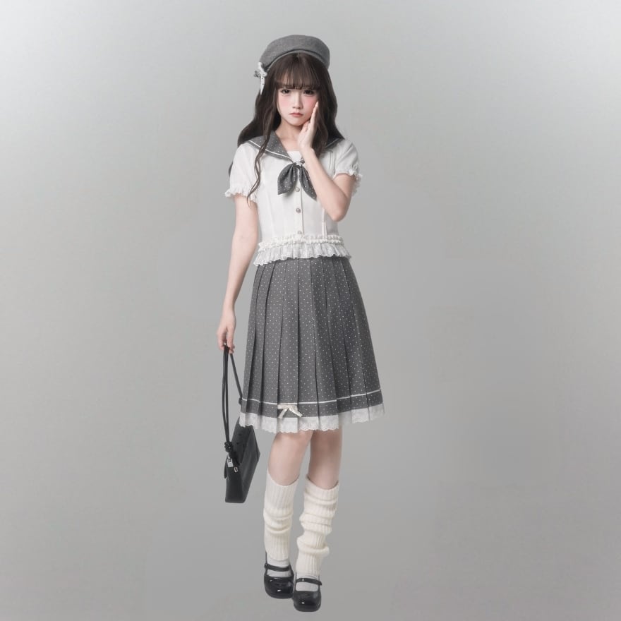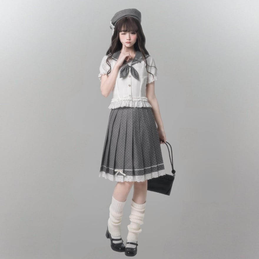 やわらかな少女感の中に、整えられた静けさがあるトップスです。セーラーカラーのきちんとした印象と、袖口や裾に重なるフリルの甘さが重なることで、制服風の可憐さをやさしく引き立ててくれます。グレーのリボンが加わることで、ただ甘いだけでは終わらない、少し知的な佇まいにまとまります。