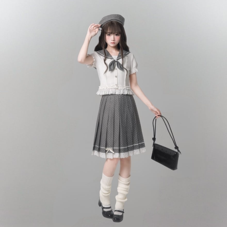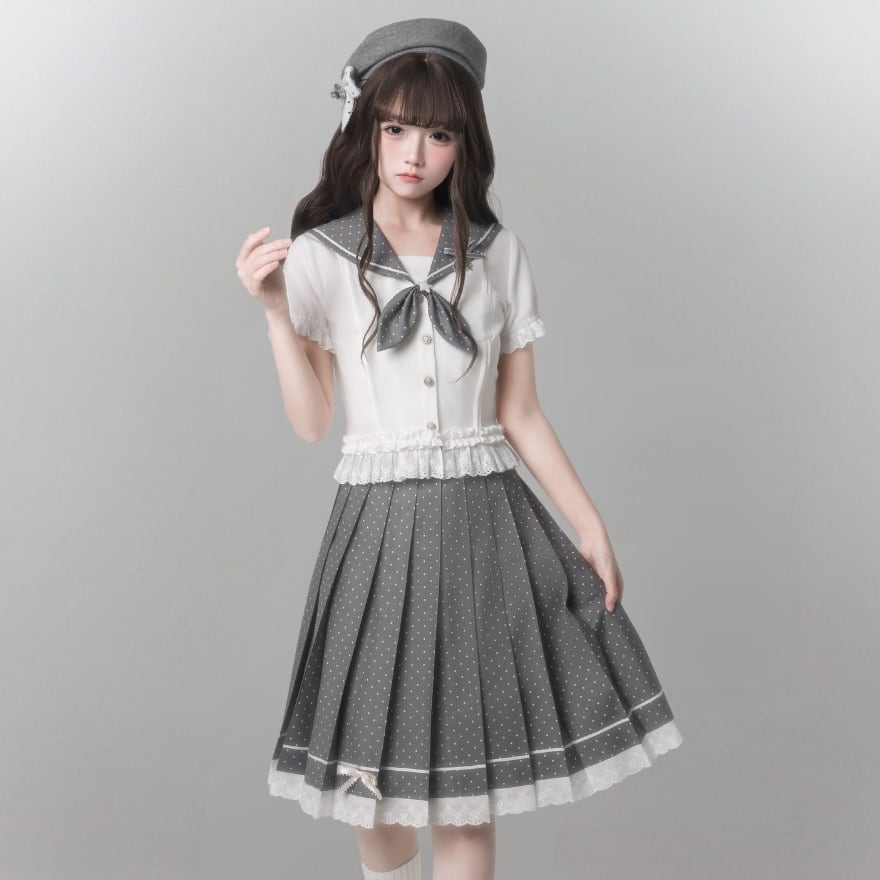 整えられた少女感には、派手すぎない甘さがよく似合います。グレーの静かな色合いに、裾のレースと小さなリボンを重ねることで、このスカートは制服風の可憐さと、少しだけ大人びた余韻を同時に描きます。動くたびにふわりと広がる表情まで、やさしい物語を宿したような佇まいです。