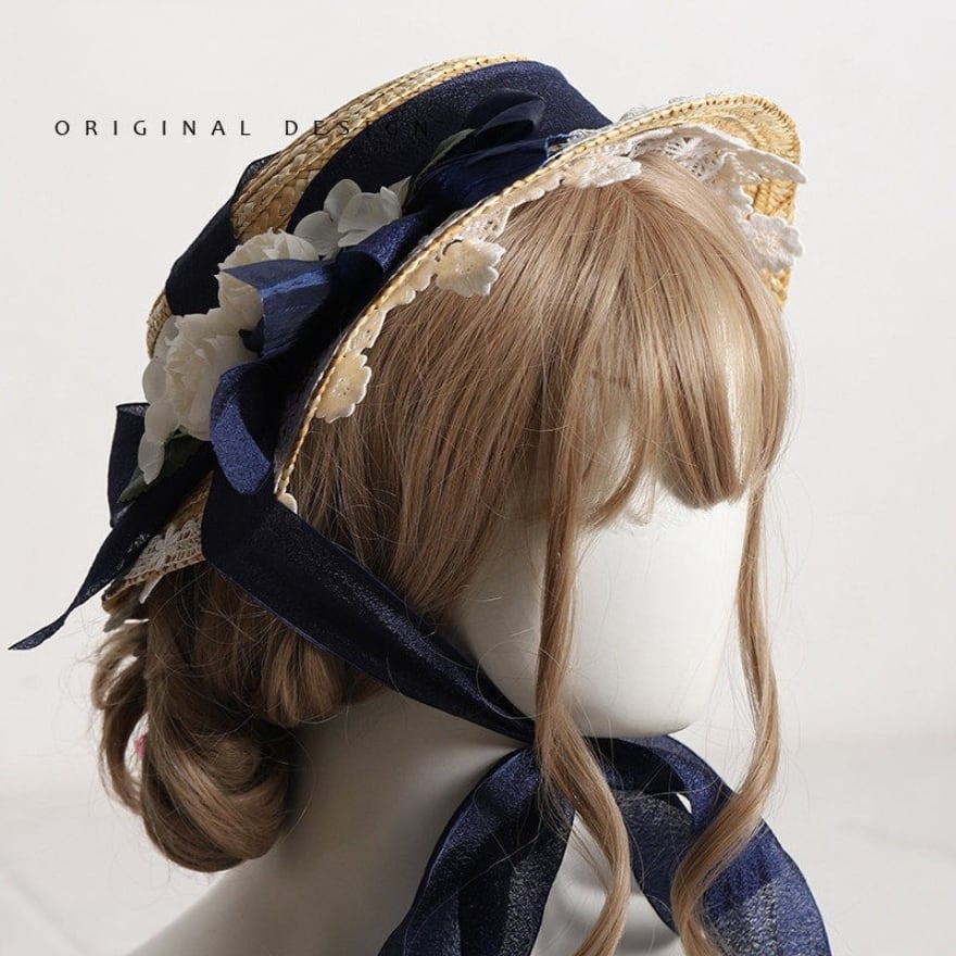 夏の光をやさしく受け止める、可憐な空気をまとった麦わらハットです。花飾りと長めのリボン、つばまわりの繊細なレースが重なり、装いの印象をふわりと華やげてくれます。被るだけで季節感と物語性が整う、ロリータコーデのための一点です。