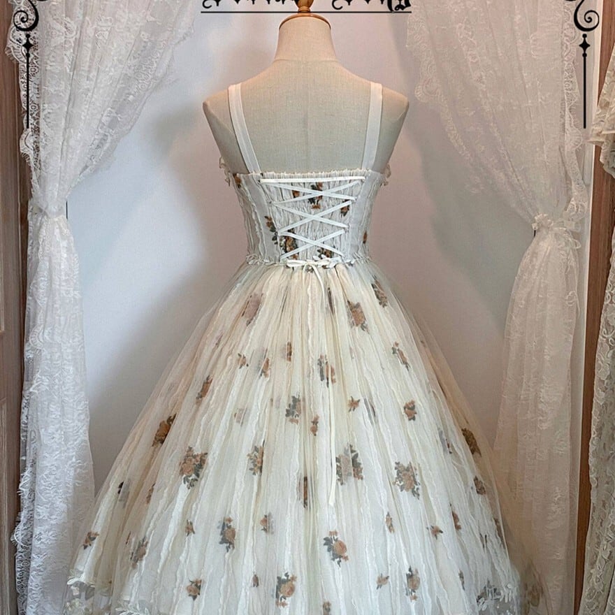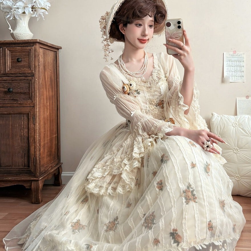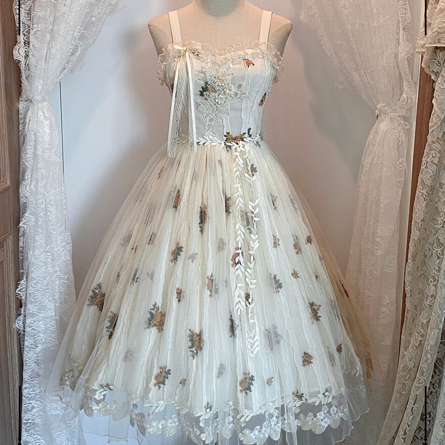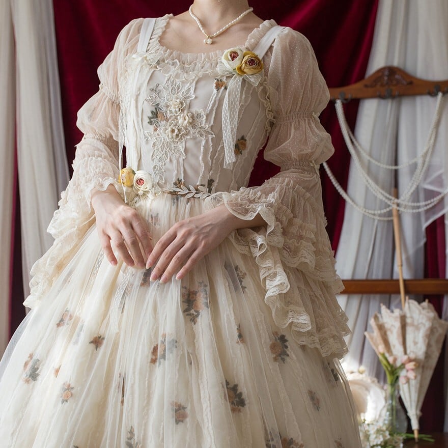 ・装飾:花刺繍、裾レース、リボンディテール