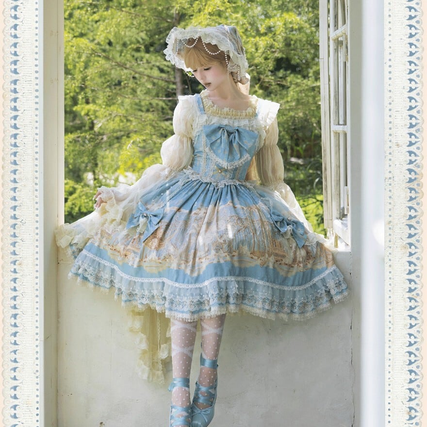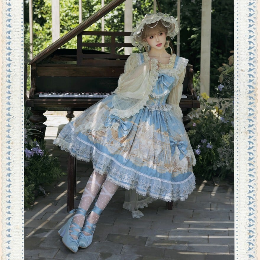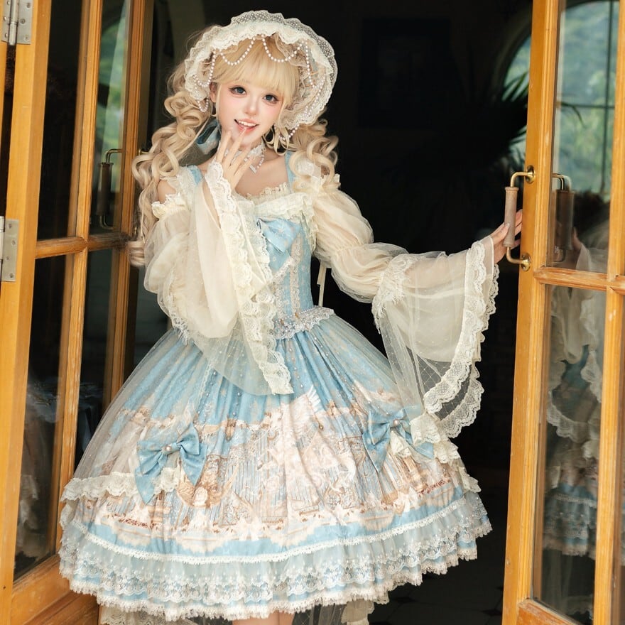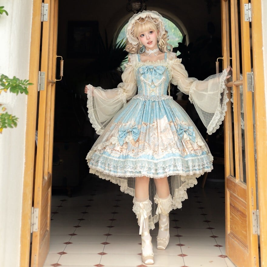 淡いブルーに幻想の断片を閉じ込めたような やわらかな印象を纏う甘ロリセットアップです ユニコーン柄のジャンパースカートに透け感のあるインナー ボンネットとKCが重なり 細部まで統一された世界観を描き出します 特別な日のために選びたい一揃いです