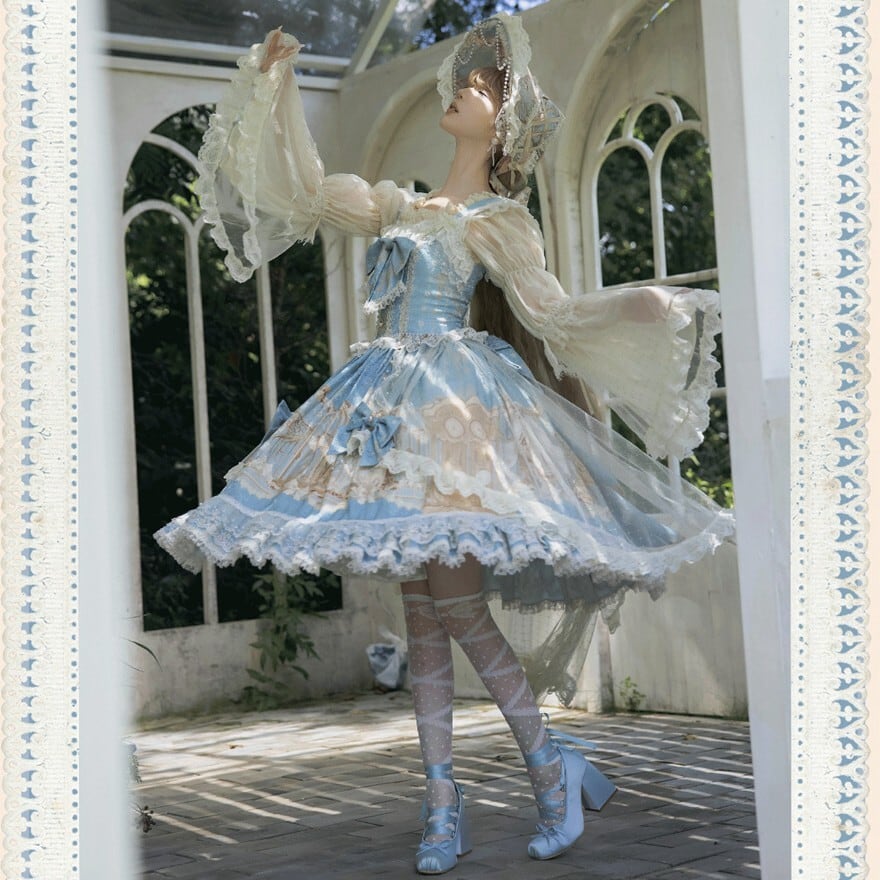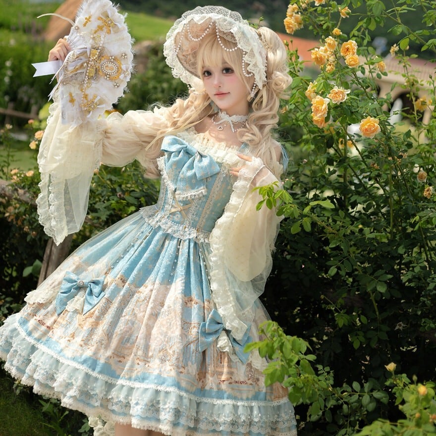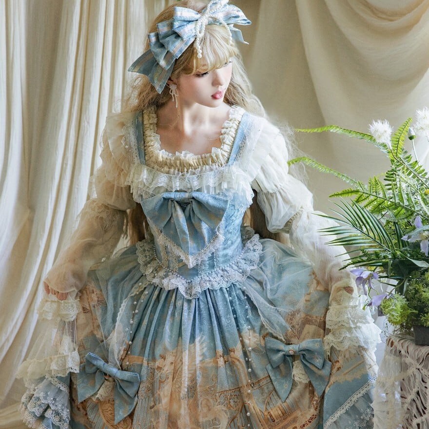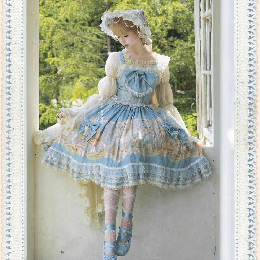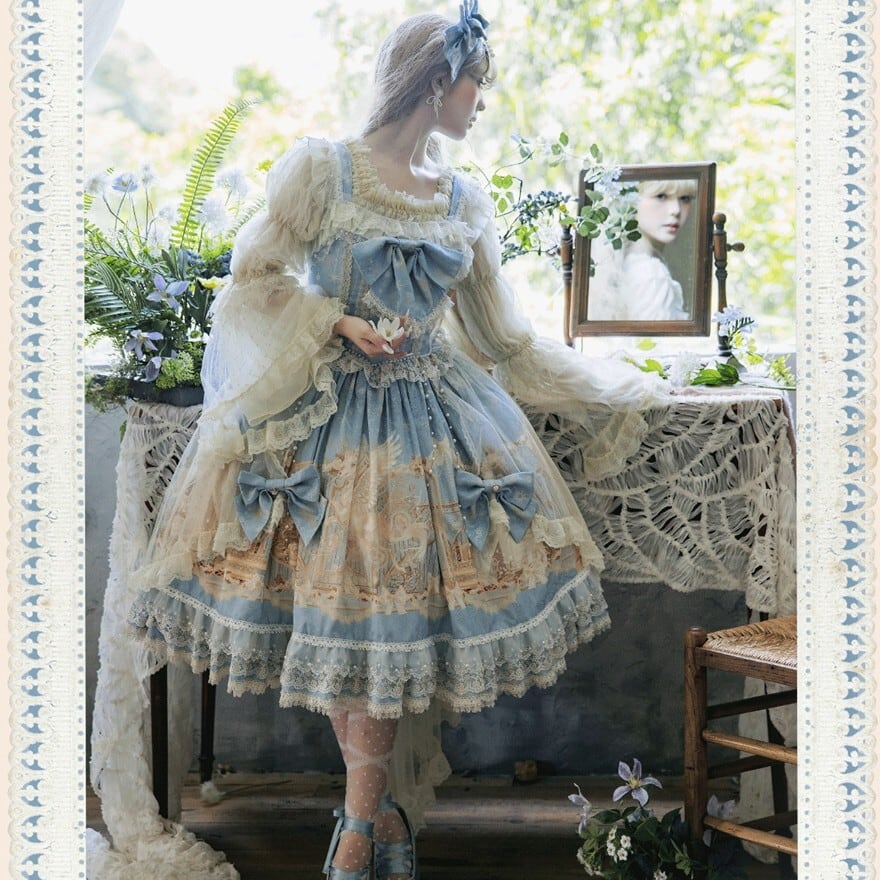 淡いブルーに幻想の断片を閉じ込めたような やわらかな印象を纏う甘ロリセットアップです ユニコーン柄のジャンパースカートに透け感のあるインナー ボンネットとKCが重なり 細部まで統一された世界観を描き出します 特別な日のために選びたい一揃いです
