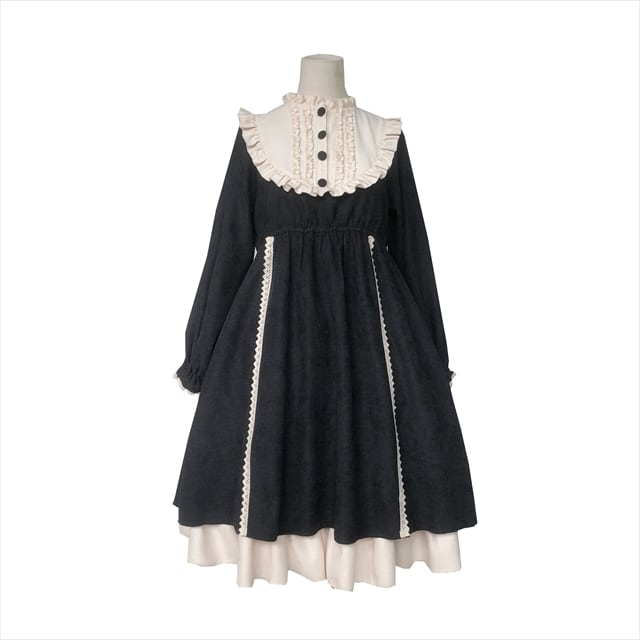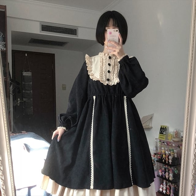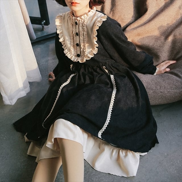 トラッドな印象のレトロなゴスロリワンピースです。レースの刺繍にふわっとしたスカートが病み可愛い。