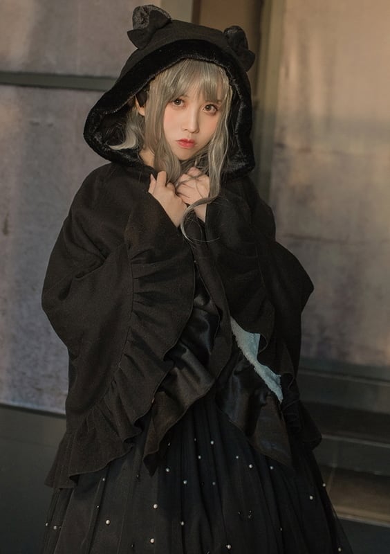 黒猫の着ぐるみを纏ったような病み可愛いゴスロリマントです。猫耳の可愛さ、ガーリーな袖フリルが可愛いシルエット。ロリィタコーデのアップグレードにおすすめです。