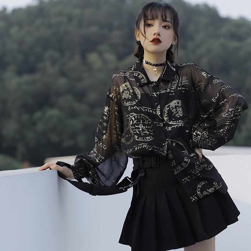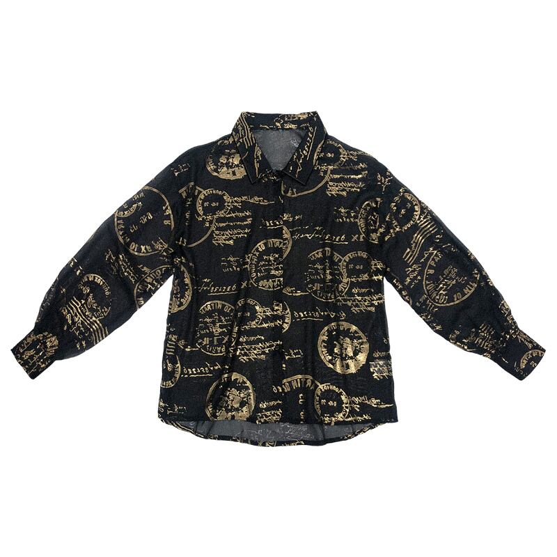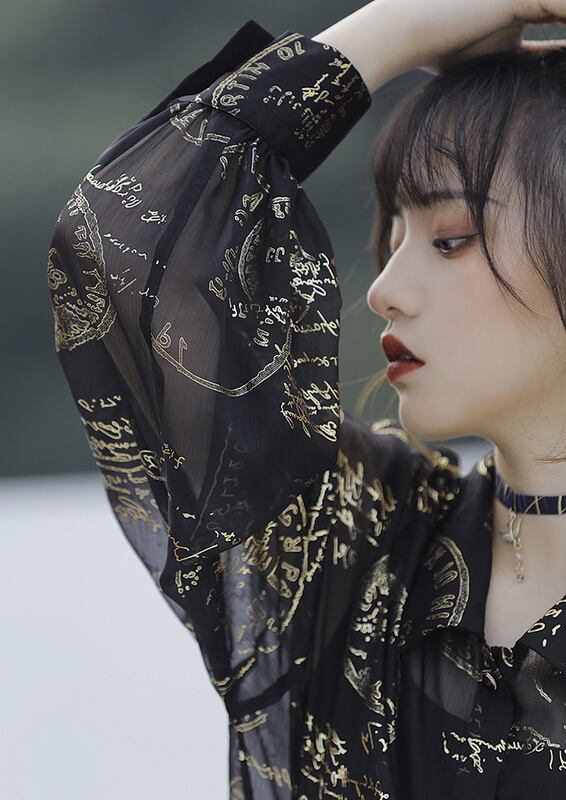 黒の長袖にレトロなゴールドが病み可愛い長袖シフォンシャツです。適度なとろみ感とゴージャスなゴールドが病み可愛さの中にも上品さが漂うシャツです。