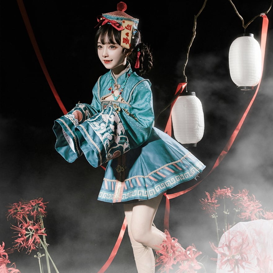 トランペットスリーブとプリーツスカートが女性らしい印象を与える一方、キョンシーを彷彿とさせるデザインにはゆめかわな装飾が施されており、かわいらしさと不思議さを併せ持っています。