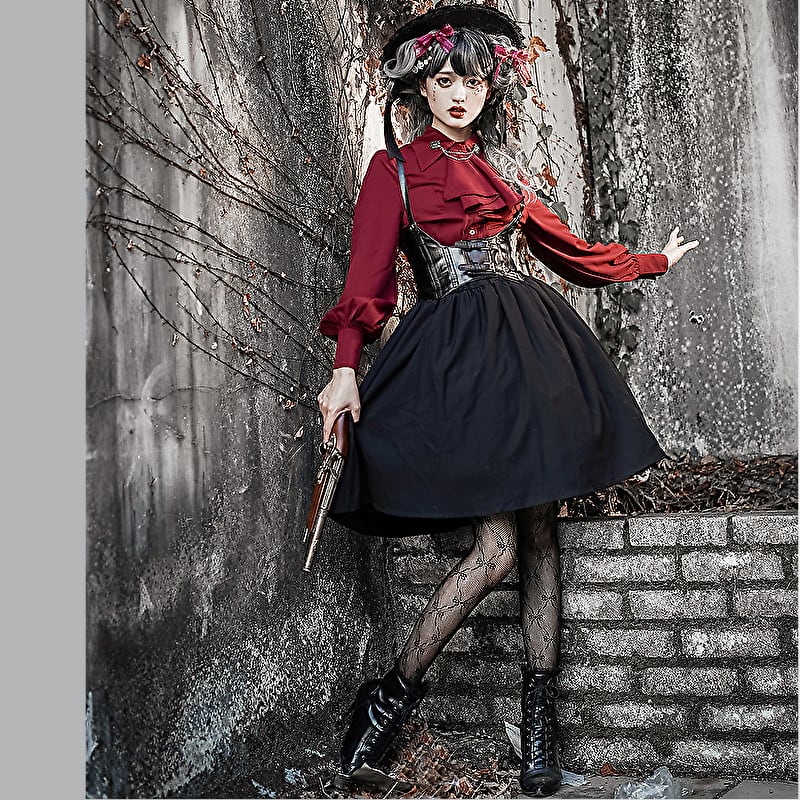 コーデ次第でロリィタ系としても病みかわいいゴシックなコーデとしても使い回せるウエストベルト付きスカートです。