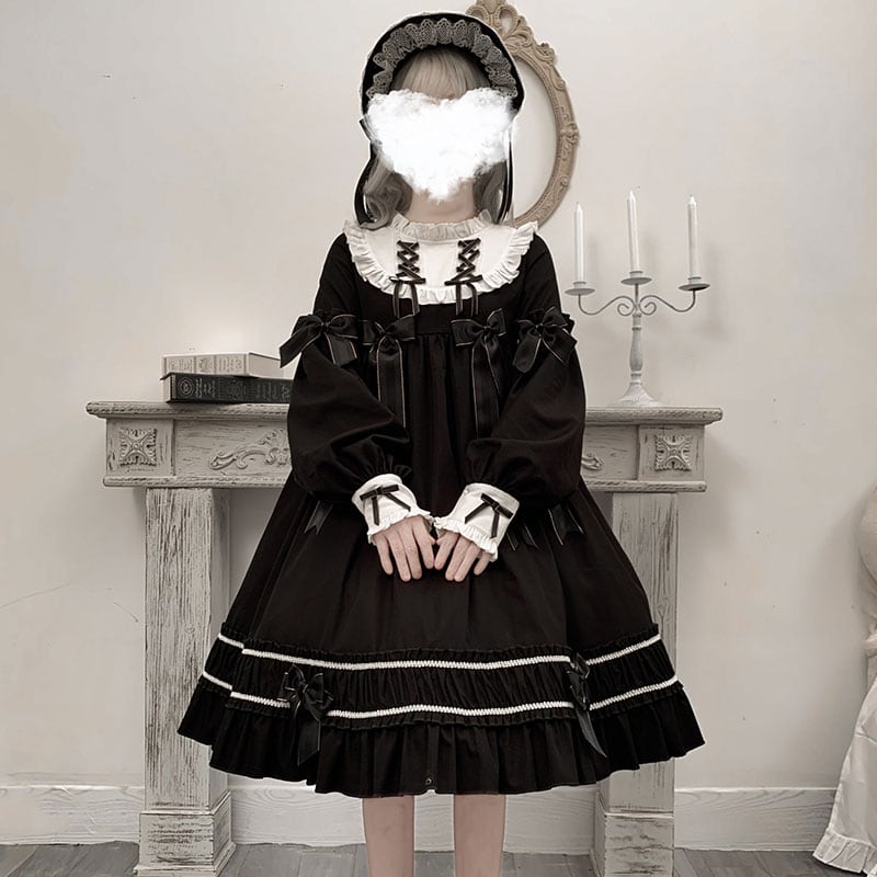 ふんわりしたシルエットに定番のネックギャザー、編み上げに大きなリボンの黒ワンピ