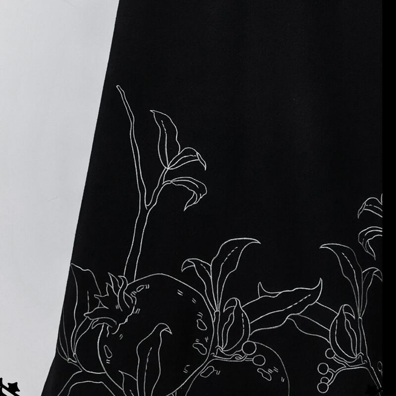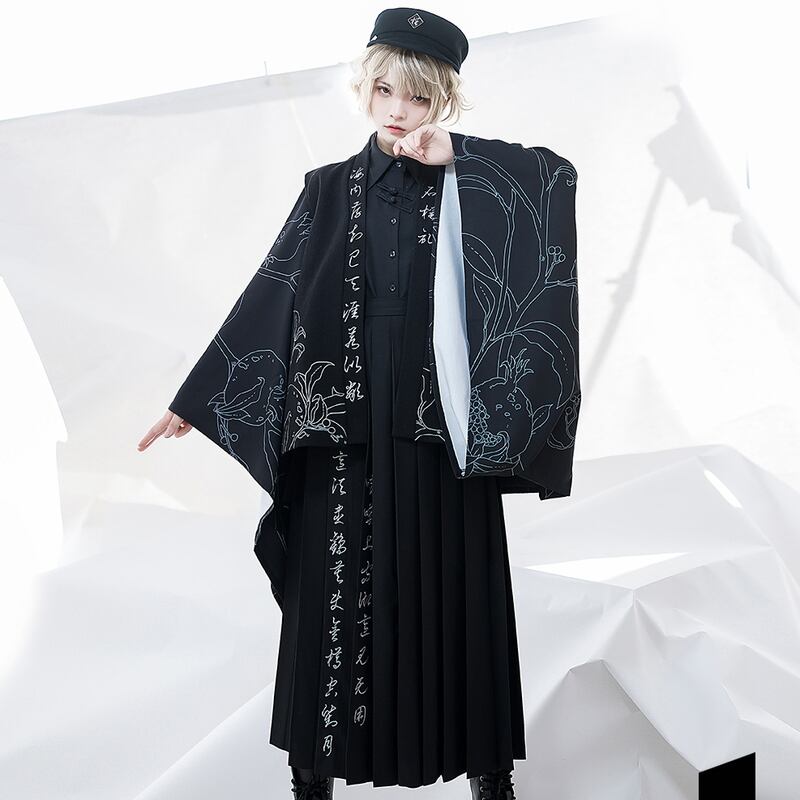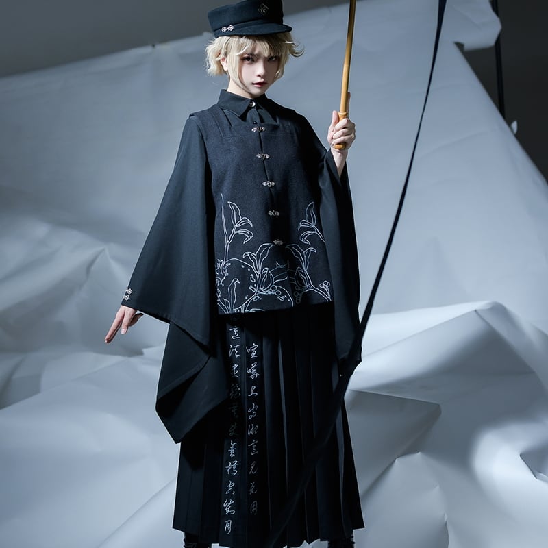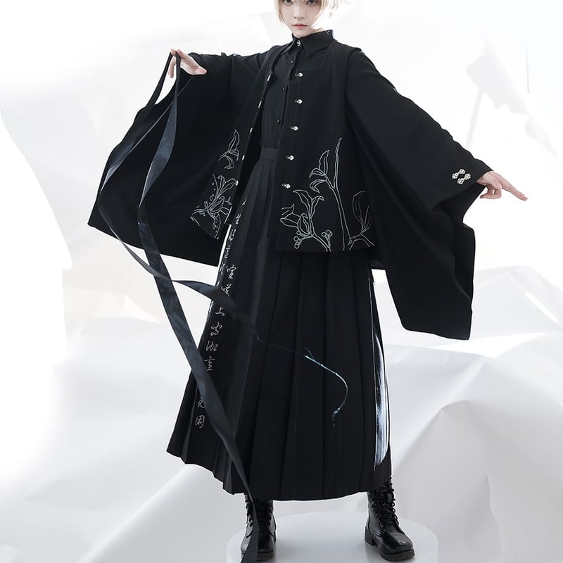 漢字に花柄デザインの刺繍が個性的なロングベストに着物風ワイドスリーブの黒シャツ、ロングプリーツの漢字柄スカート
