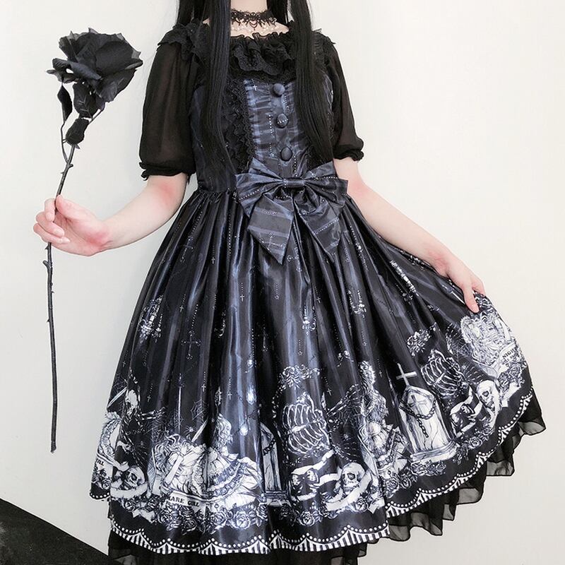ドクロに十字架、墓場のイラストがシュールなゴスロリドレス