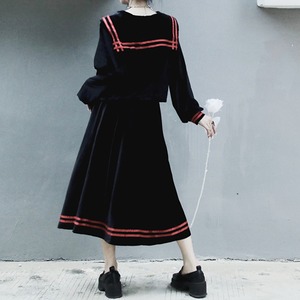 三日月刺繍のセーラー服にボトムスはハイウエストロング丈のプリーツスカート