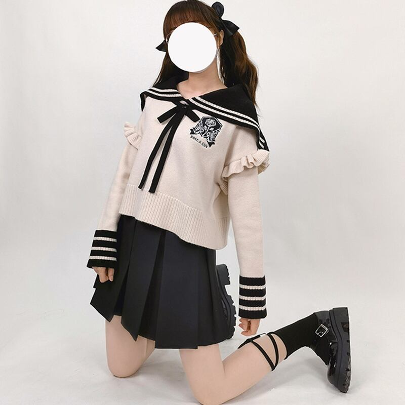 SEASONZ ゴスロリ系 Catwish 秋冬 ニット セーター セーラー服 ROSE刺繍 スリーブ フリル JK 可愛い 量産型 原宿 病み系 ゆめかわ