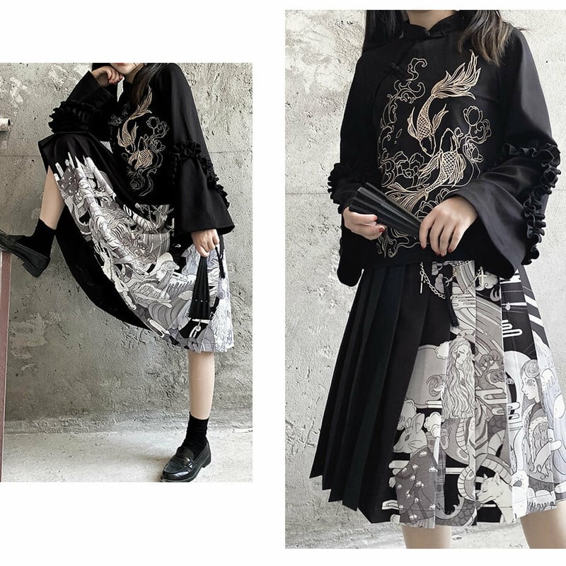 SEASONZ レトロ プリーツスカート 膝下丈 プリント柄 病み可愛い ゴシック 地雷系