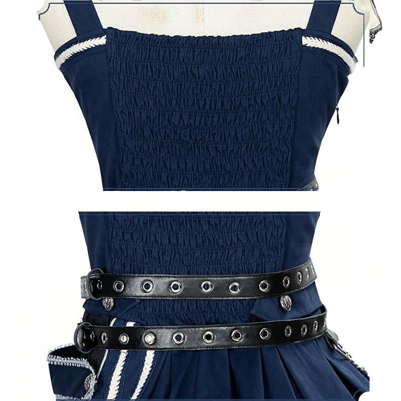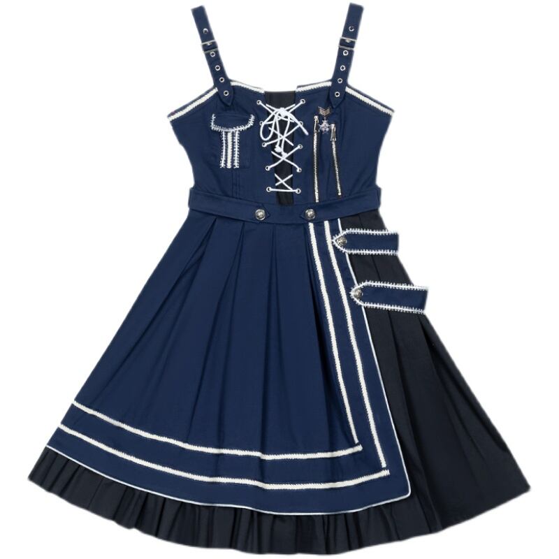 ネイビーカラーにスカート裾はラインデザイン、編み上げクロスに高見えな装飾がおしゃれ