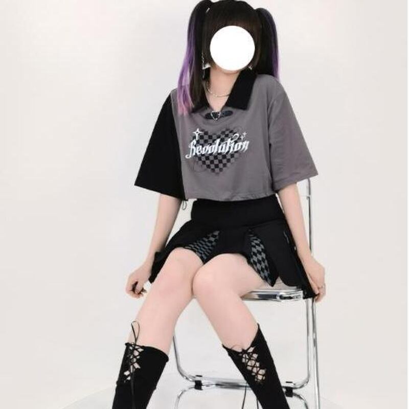 SEASONZ ゴスロリ系 Catwish ショート丈 バイカラー Tシャツ チェッカー柄 ハート revolution 病み可愛い JK ストリート系 ろりぃた服
