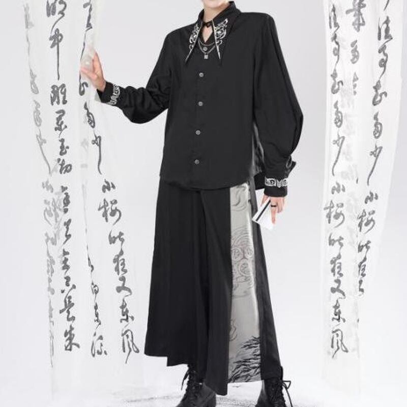 襟袖のビジュアル抜群な刺繍がおしゃれなユニセックスシャツです。