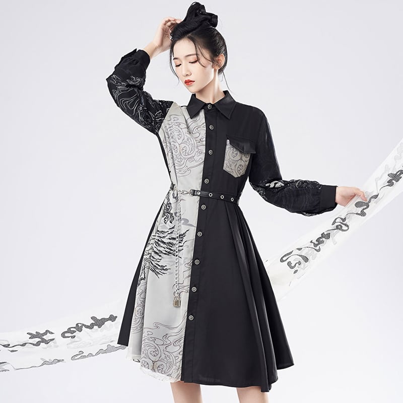 SEASONZ ワンピース バイカラー レトロ ChineseGothic ミドル丈 ウエストベルト付き 病み可愛い ストリート系 地雷系 ゆめかわ
