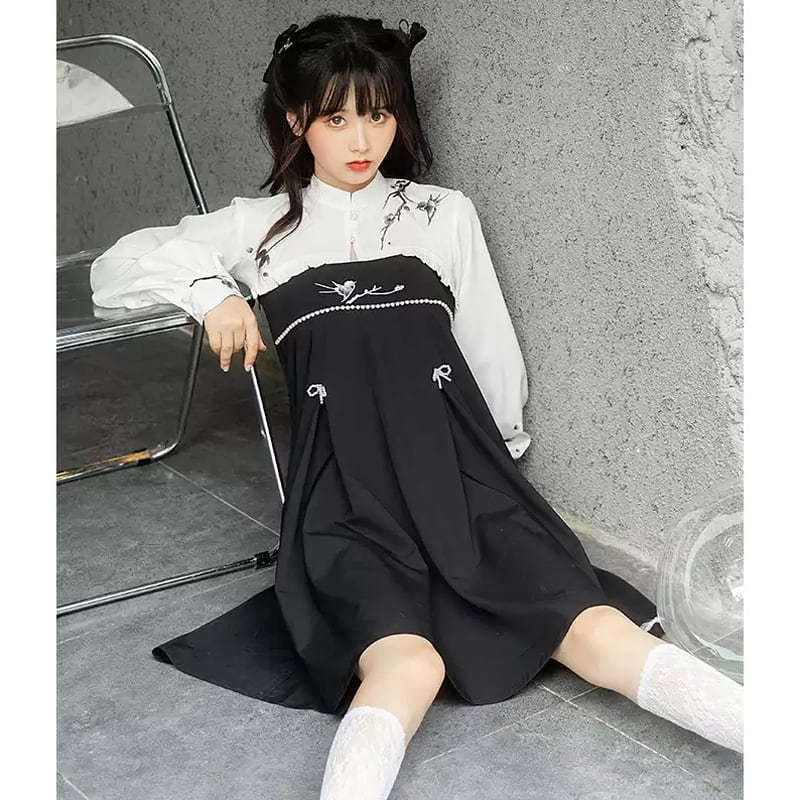 レトロな漢服スタイルのブラウスにミドル丈のサスペンダースカートです。