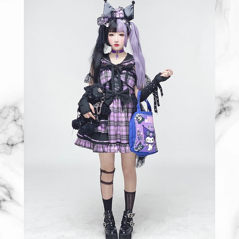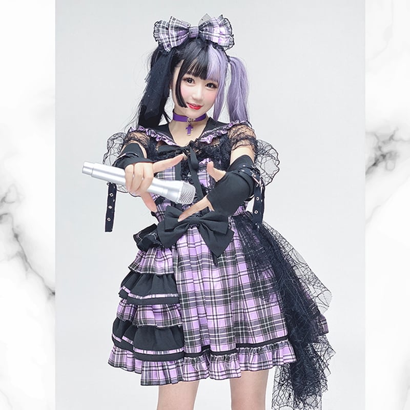 ブラックパープルのチェック柄アイドル系ワンピ