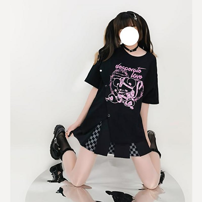 SEASONZ Catwish 半袖 Tシャツ 異形ボタン留め 小熊 プリント柄 英字ロゴ Sweet Cool かわいい JK ストリート系 ろりぃた服