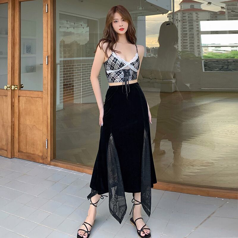 SEASONZ スカート ロング丈 スリット入り レース ハイウエスト ベルベット ストリート系 病み可愛い ゴシック ゆめかわ