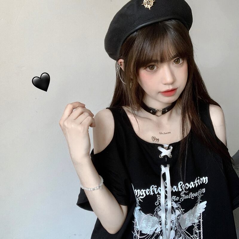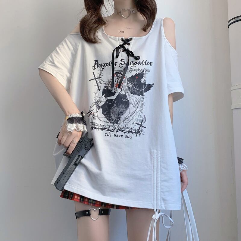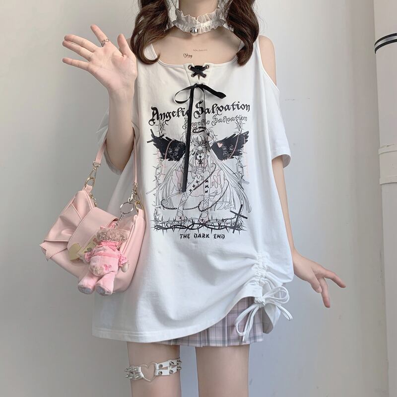 CRAZYGIRLオリジナル、クールなオフショル、エンジェルプリントTシャツです
