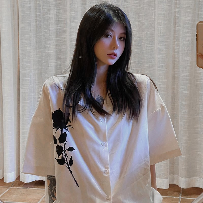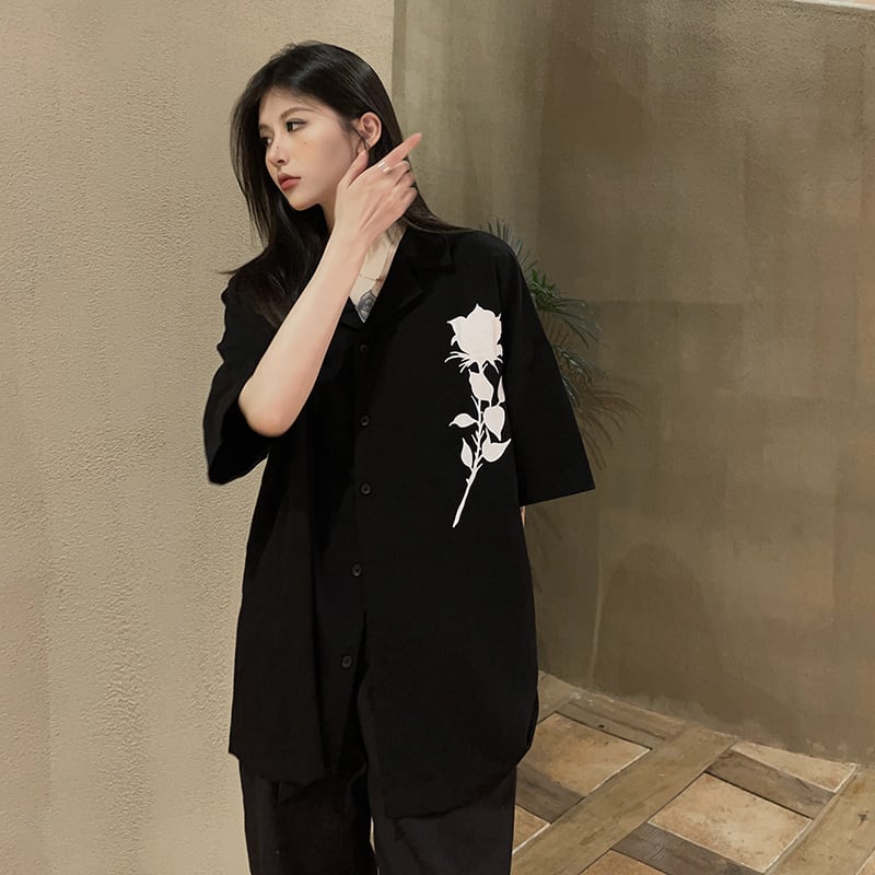 ワントーンカラーにワンポイントの薔薇、バックロゴがおしゃれな半袖シャツです