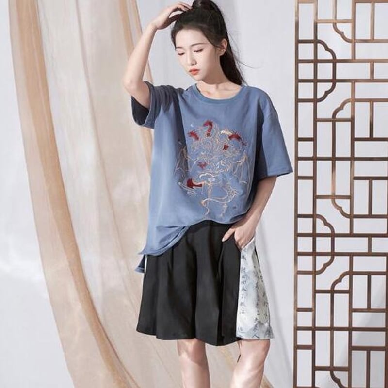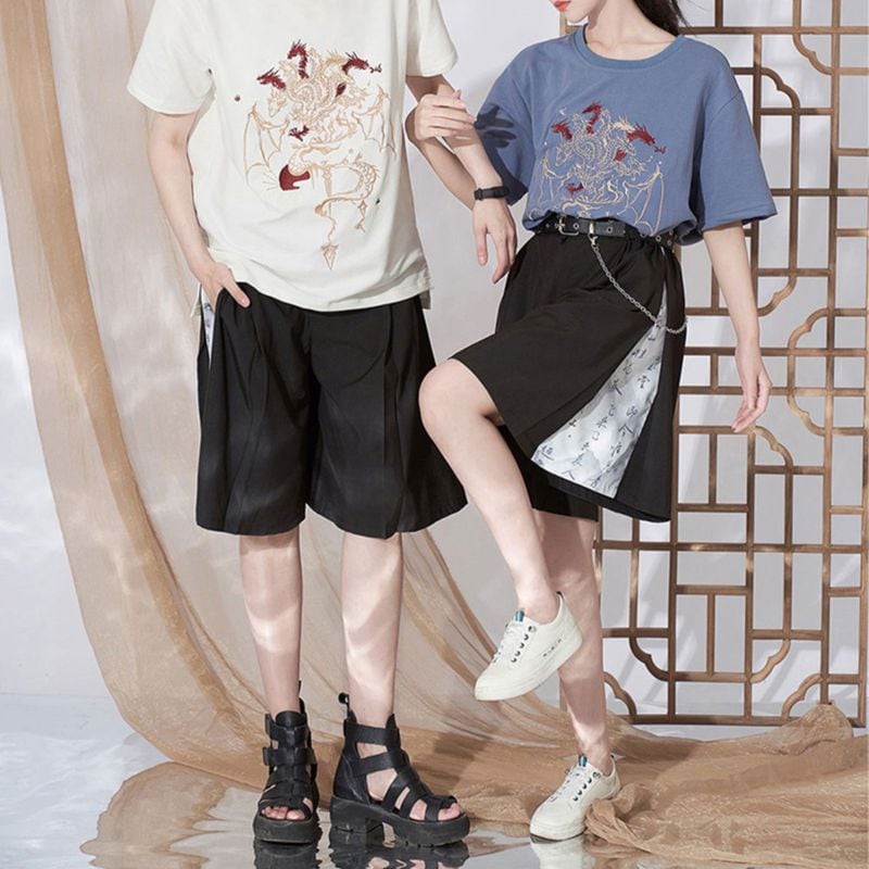 サイドのさりげない漢文のプリントがユニークでおしゃれなショートパンツです。