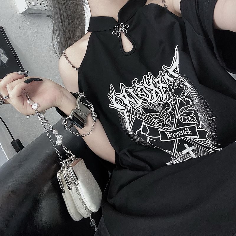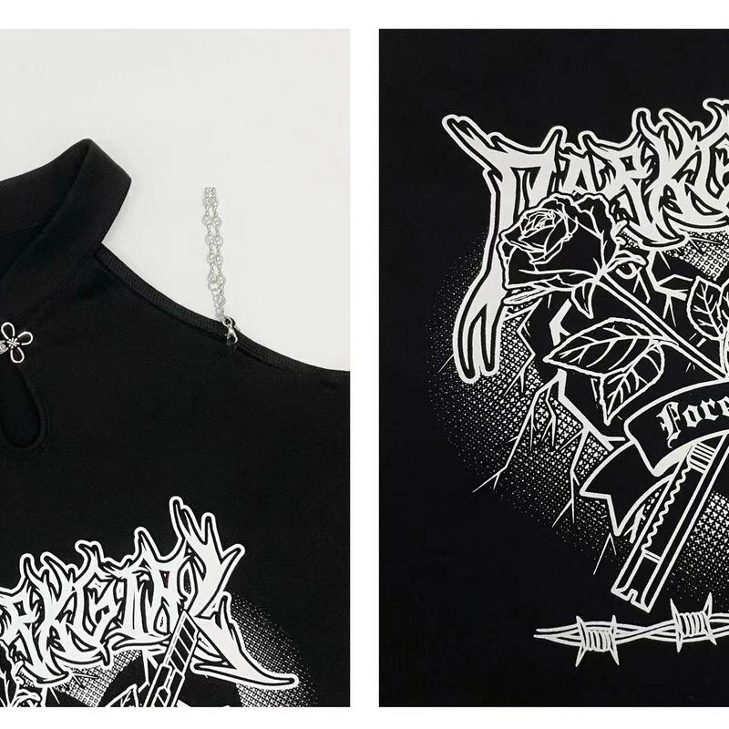チャイナ服風の襟とロックなロゴのプリントがかっこいいです。