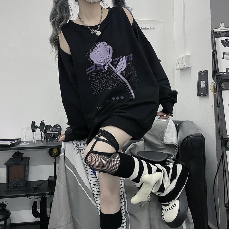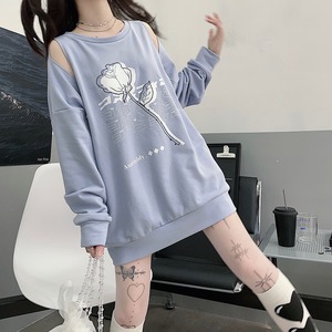 CRAZYGIRLオリジナル、オフショルに薔薇プリント柄の長袖トレーナー
