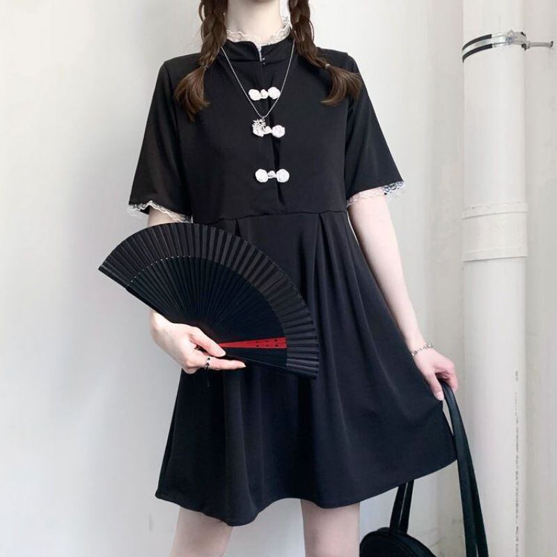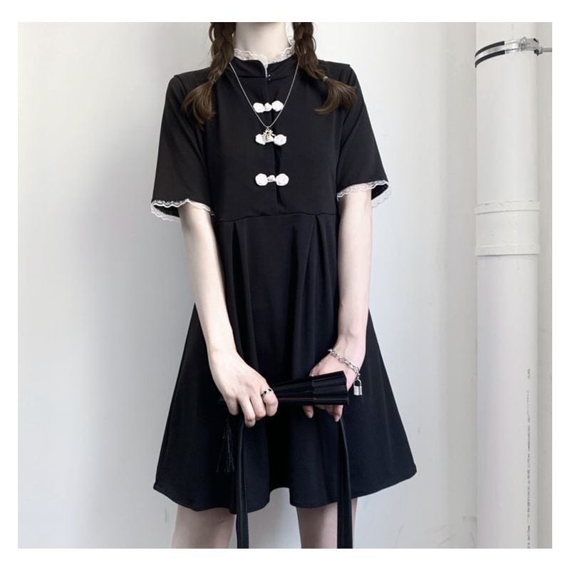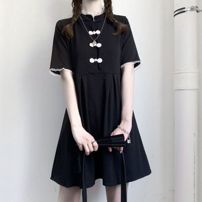 SEASONZ ワンピース 半袖 ショート丈 レース レトロ チャイナ風 ゴスロリ 病み可愛い ロリィタ ストリート系 かわいい JK ゆめかわ