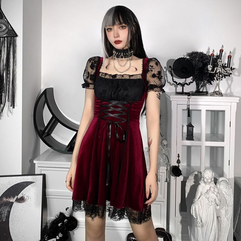 SEASONZ ドレス ワンピース ミニ丈 半袖 レース コルセット レースアップ ゴシック ゴスロリ ストリート系 病みかわいい バンギャ サブカル ゆめかわ