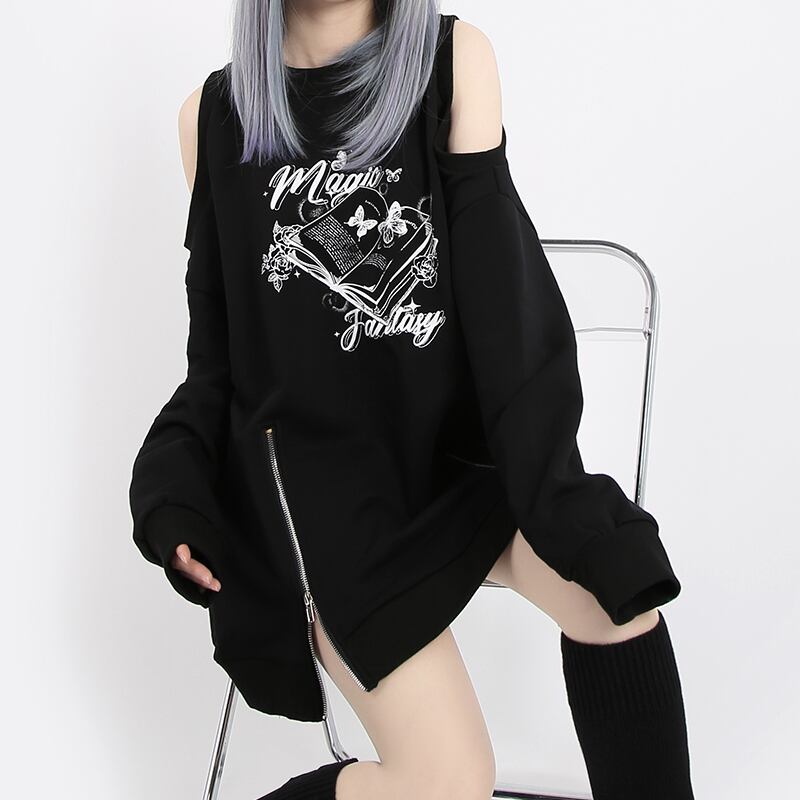 オフショルデザインに裾はダブルのZIPファスナーのトレーナー