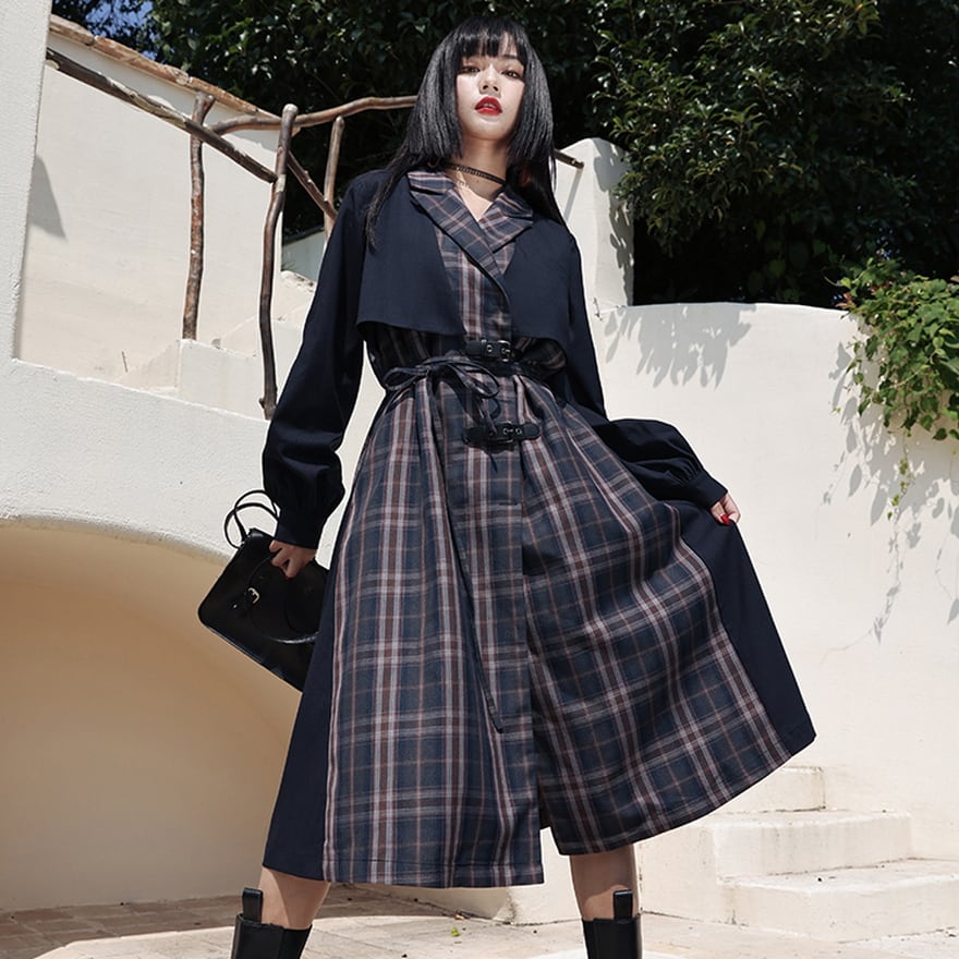 SEASONZ サブカル系 ワンピ フェイク レイヤード ジャケット チェック柄 ハイウエスト 病み可愛い サブカル系地雷 ストリート系 JKゆめかわ