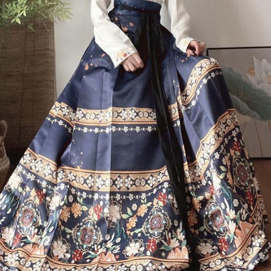 チャイナ服スカートの特徴的なハイウエストロング丈に華やかな花柄プリントがおしゃれ