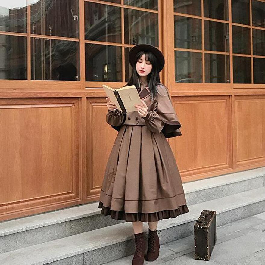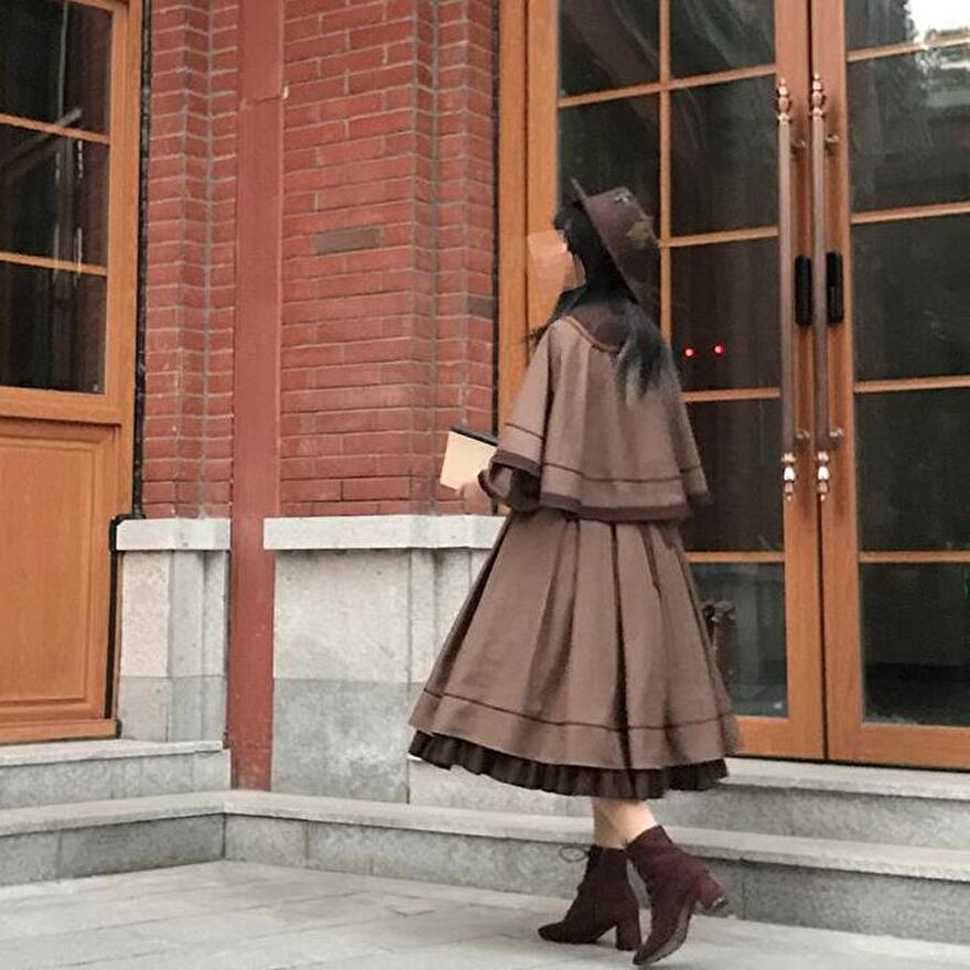 落ち着いたかわいさのクラシカルなワンピース+ケープ+ネクタイのセット。