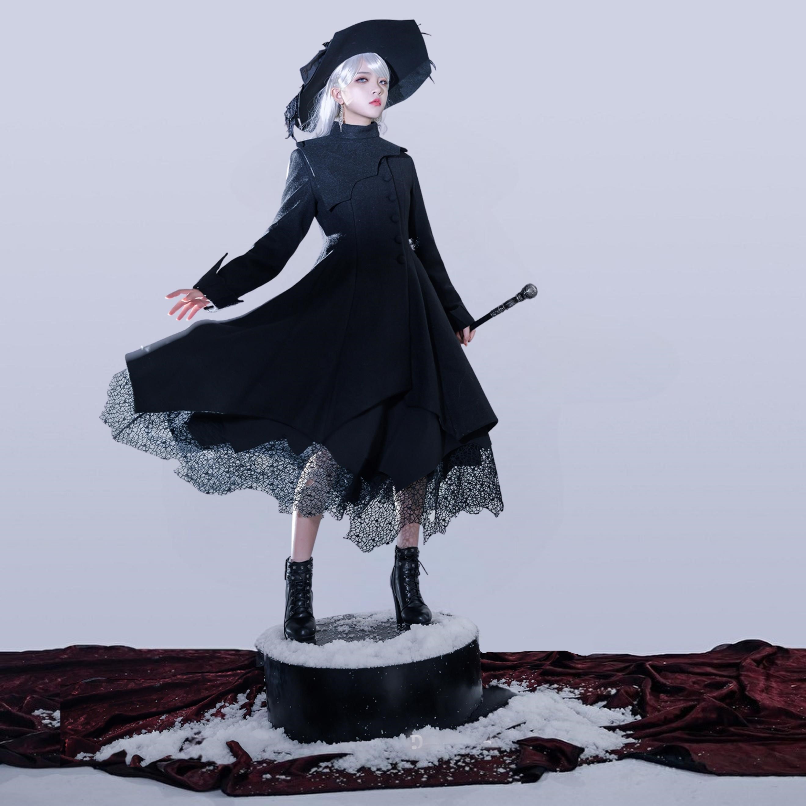病み可愛いdarkなシルエットにアシンメトリーな着丈がおしゃれな麗人風ロングコート