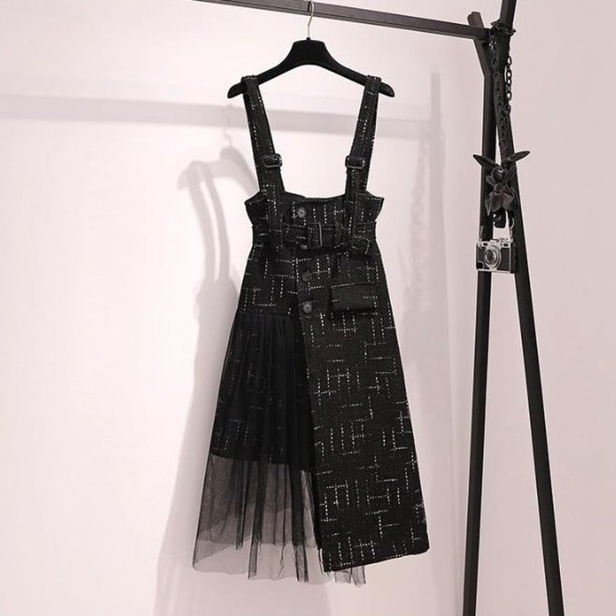 シックなブラックのトップスにレースとツイード調のアシンメトリースカートのセットです。