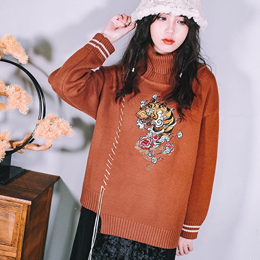 SEASONZ 古怪舎 ニット セーター タートルネック 薔薇 寅 刺繍 アシンメトリー 編上げ ストリート系 普段着使い 控えめ ゆめかわ