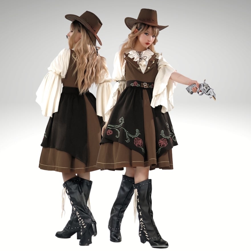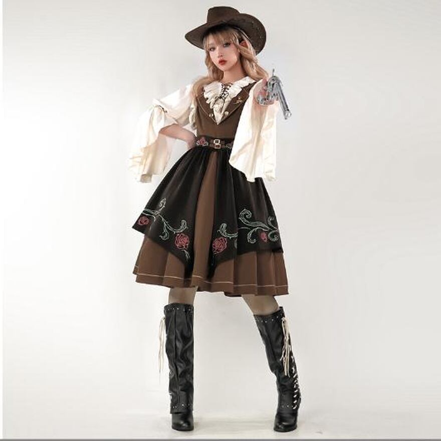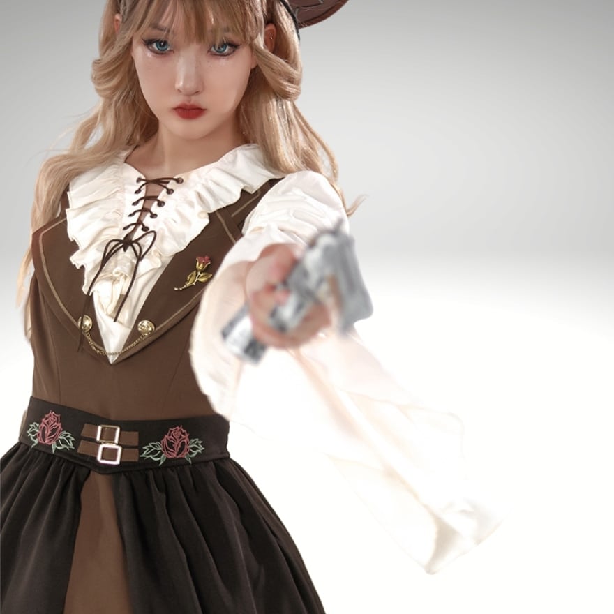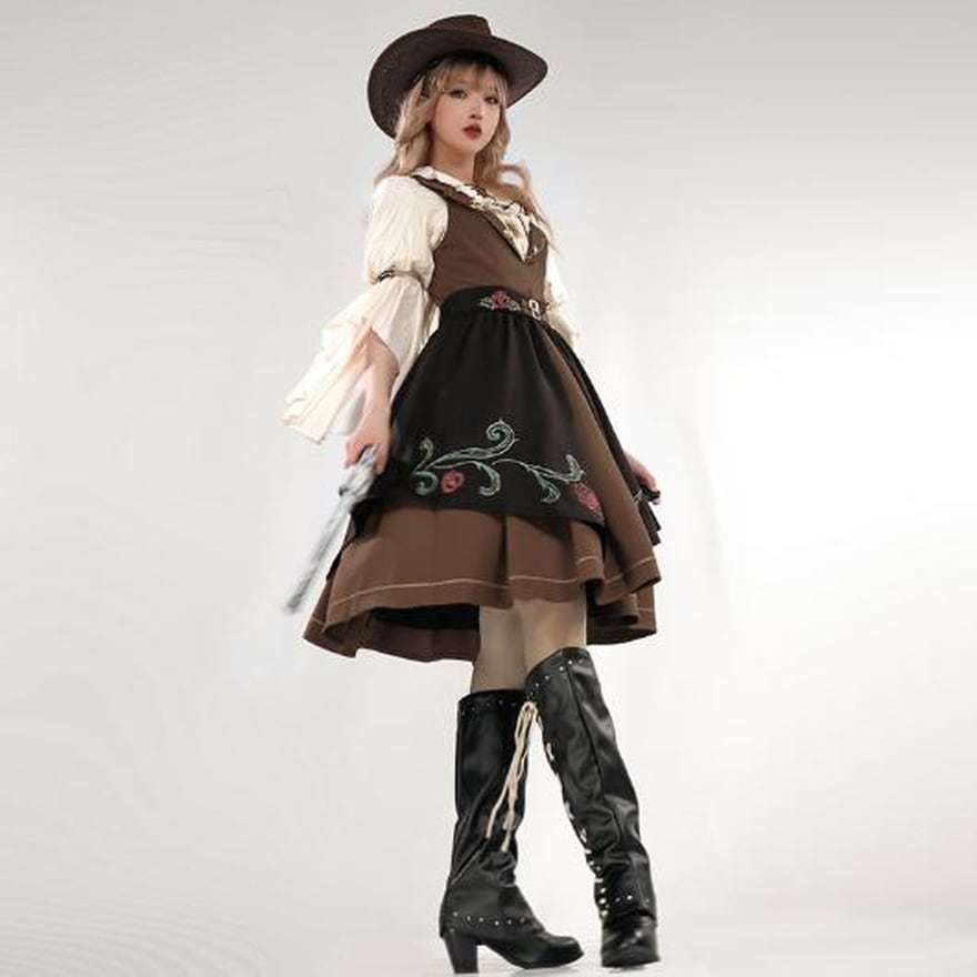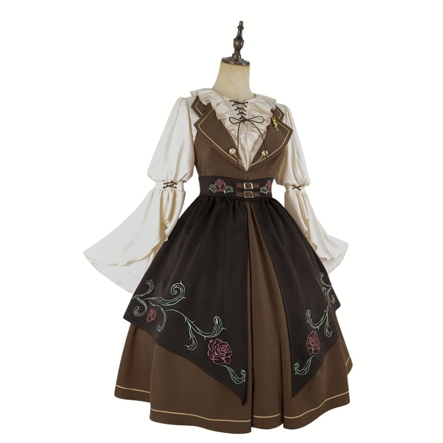 スチームパンクのようなノスタルジックなデザインで編み上げのブラウスに深V字のJSK ジャンパースカート、薔薇のエプロンがおしゃれ