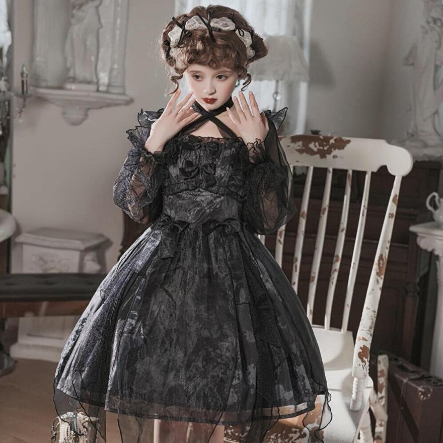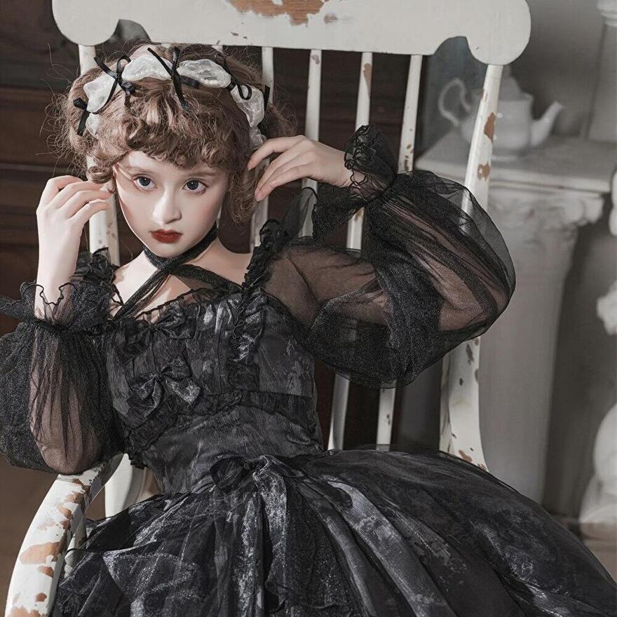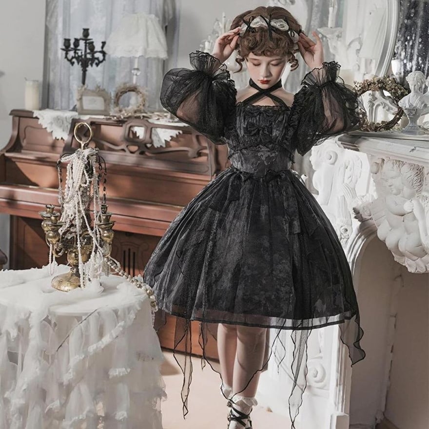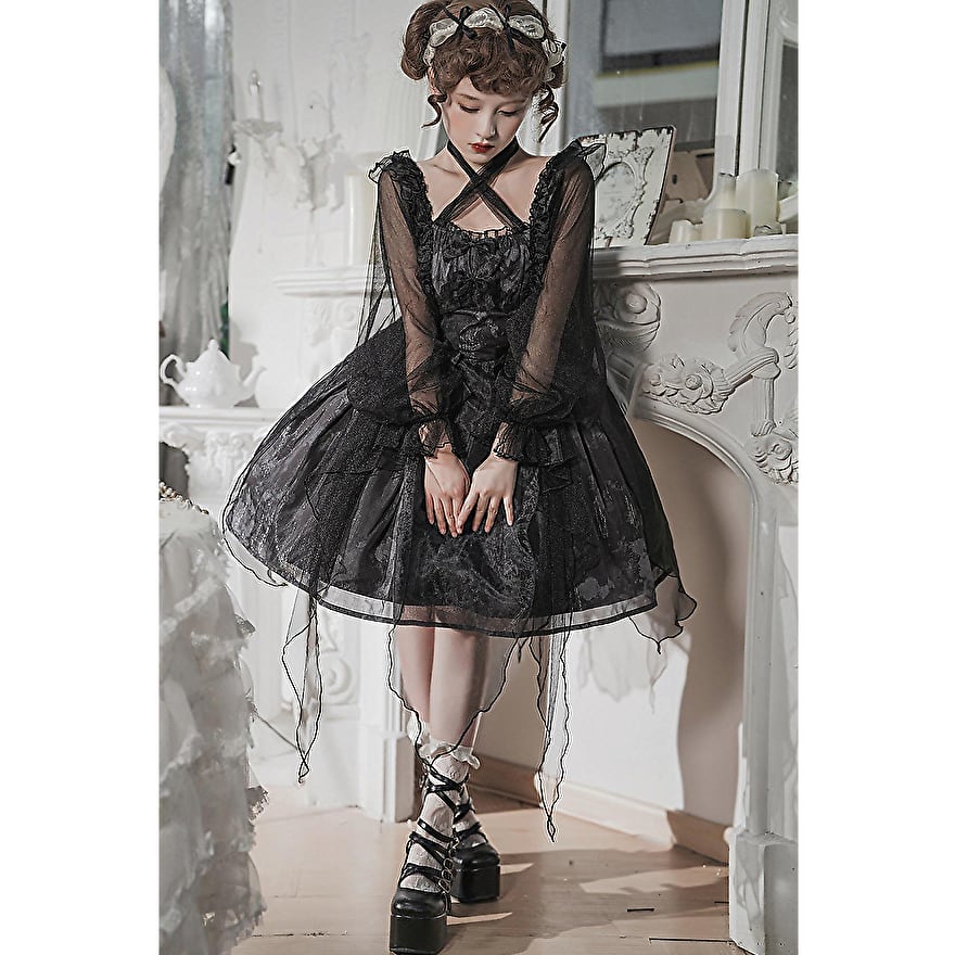 SEASONZ ロリータ ゴスロリ ドレス ミドル丈 レース 透け感 フリル サブカル系 甘い ゴシック かわいい ゆめかわ