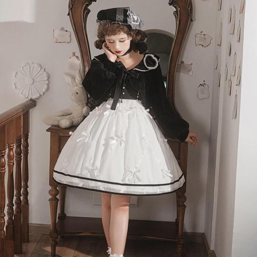 SEASONZ ロリータ クラロリ レトロ ドレス ワンピース ノースリーブ ショート丈 コート 2点セット ツーピース リボン ハイウエスト サスペンダー モノトーン ミドル丈 ゆめかわ