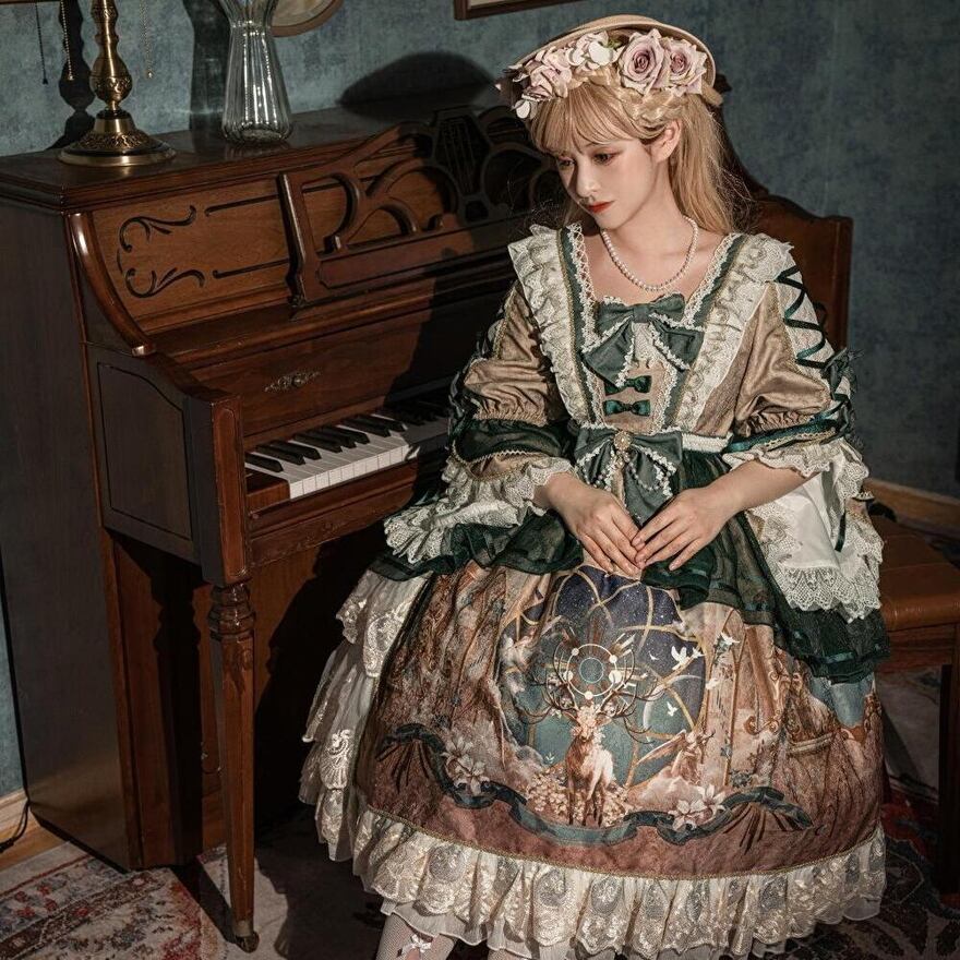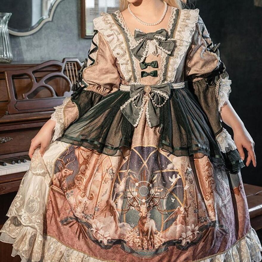 鹿の絵画がプリントされた前掛けやふんだんに使われたレースがゴージャス。