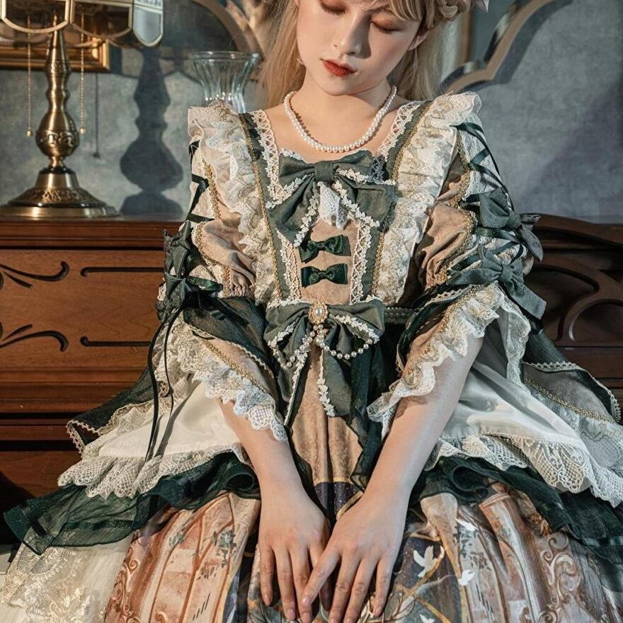 SEASONZ ロリータ スイートロリータ ドレス ミドル丈 リボン フリル レース 絵画 柄 プリント レースアップ 貴婦人 上品 高見え 豪華 ゆめかわ