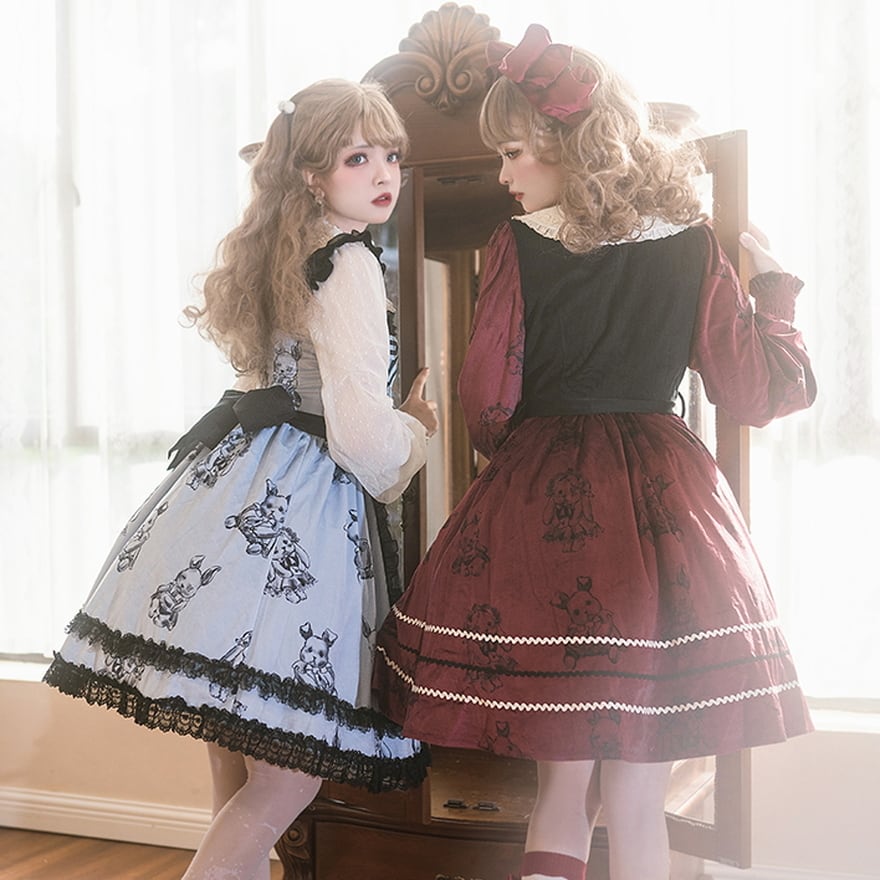 SEASONZ クラロリ 森ガール フェイク ツーピース ワンピ JSK ジャンパースカート うさぎプリント柄 可憐 少女 ノスタルジック ゆめかわ