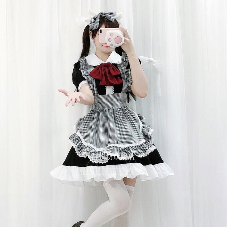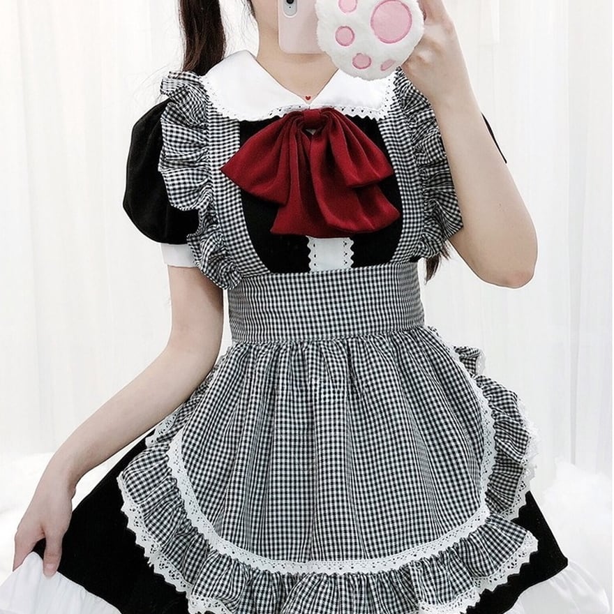大きめリボンが愛らしいチェック柄エプロンのオールインワンメイド服です