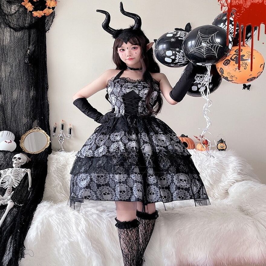SEASONZ ロリータ ドレス ゴスロリ スカル柄 ビッグホーン 病み可愛い イベント衣装 コンカフェ衣装 ゆめかわ