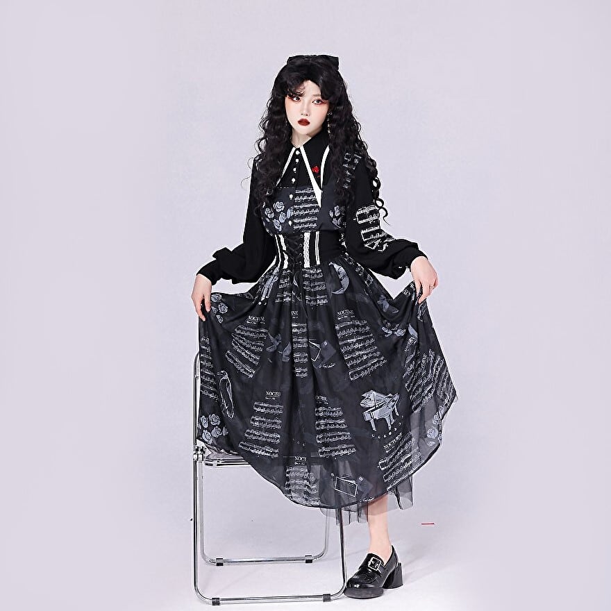 SEASONZ ロリータファッション通販 SEASOZ サブカル系 ロングスカート ハイウエスト プリーツスカート 夜曲 ノクターン 音符プリント柄 大人増し 病み可愛い ゆめかわ